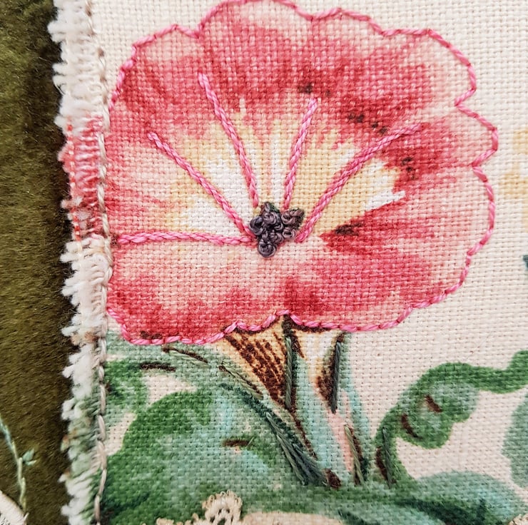 On a base of dark green velvet, and a piece of vintage floral tapestry style fabric, I have added hand embroidery touches, and vintage trims.