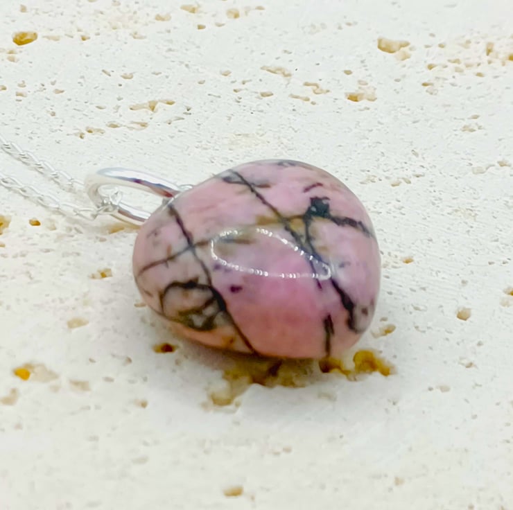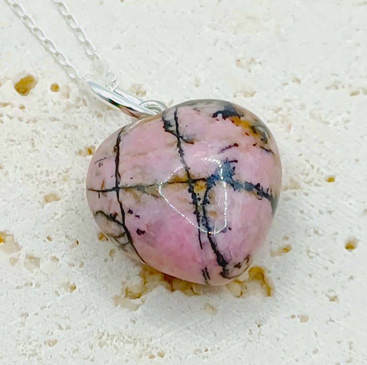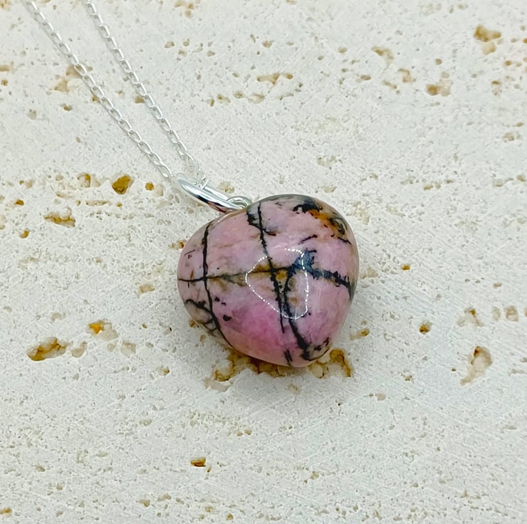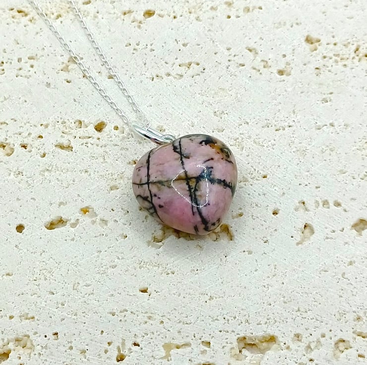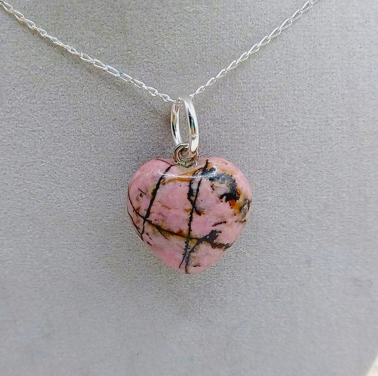 Rhodonite Gemstone Heart Pendant, Sterling Silver Necklace, Pink Heart Jewellery, Jewellery Gift for Her, Rhodonite Jewellery, Statement Gift