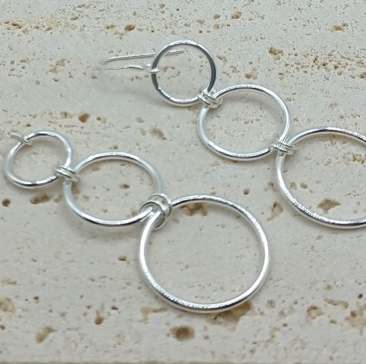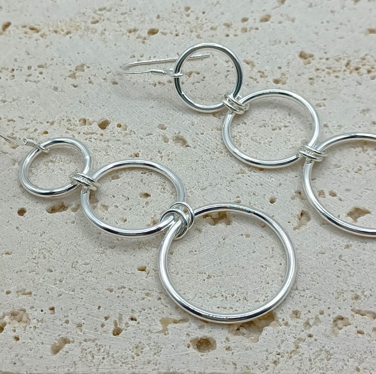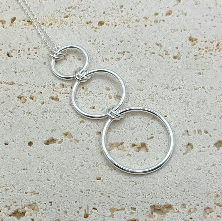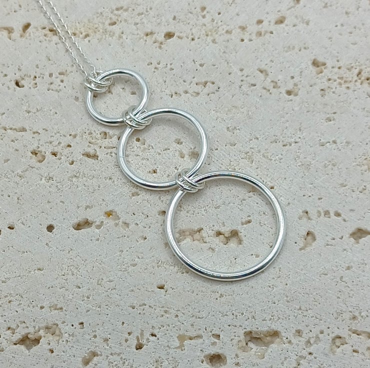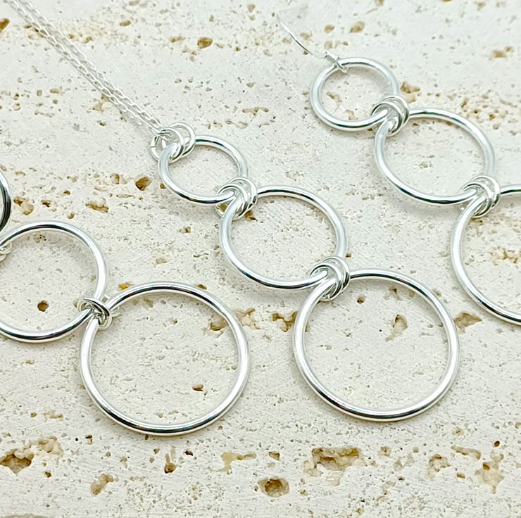 This set consists of a pendant and earrings Triple hoop set Increasing sizes of sterling silver rings, linked together to create the earrings and pendant. The earrings have sterling silver hook earwires, and the pendant is supplied on an 18 inch sterling silver chain (style may vary). The largest rings is 25mm.