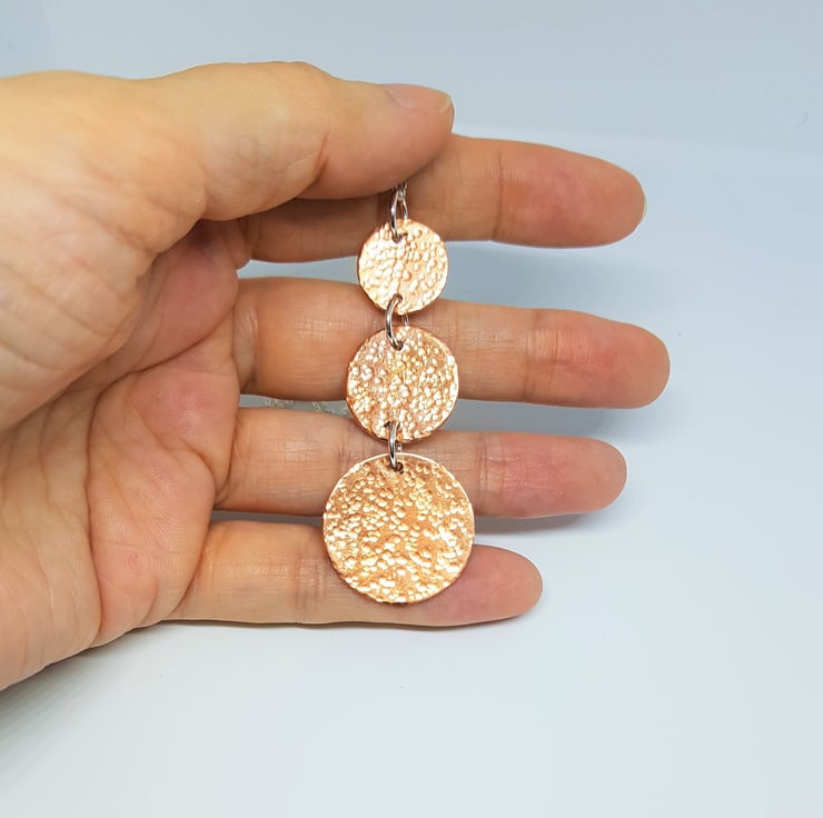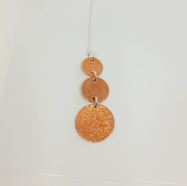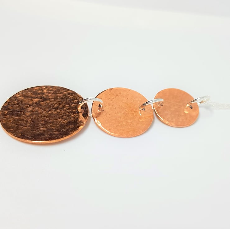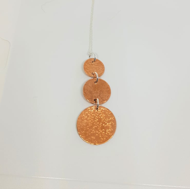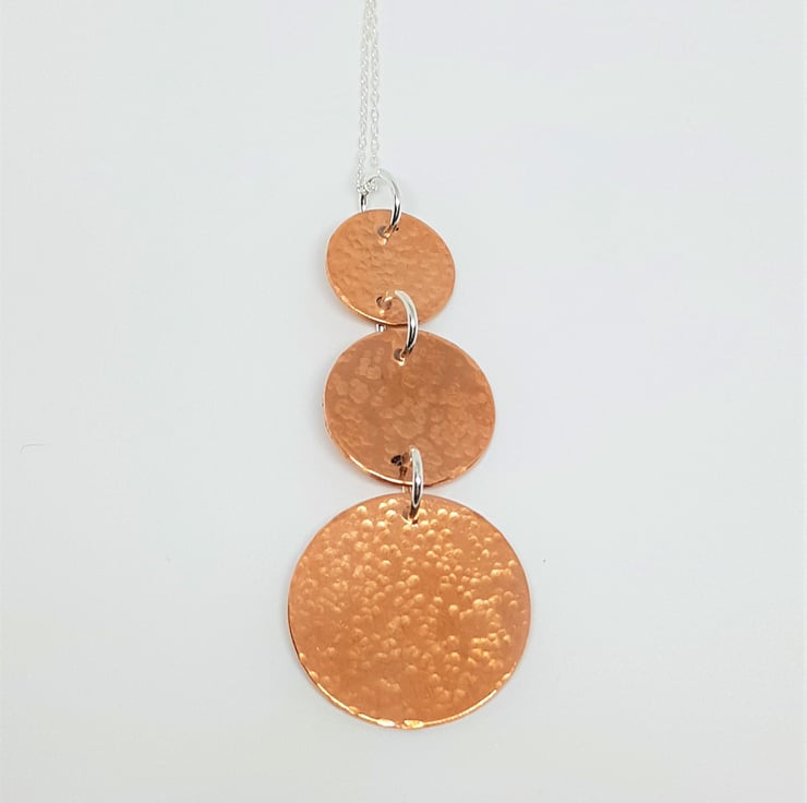 The necklace features a trio of different sized hand textured copper discs, linked together with sterling silver. It is a long pendant it measures approximately 7cm from top to bottom. The discs are textured by hand using traditional metalsmithing techniques.
