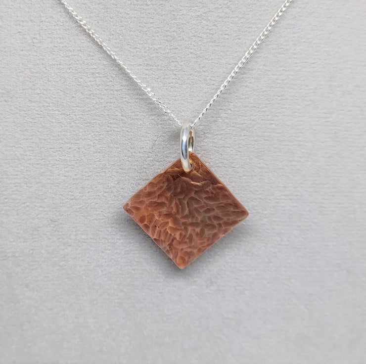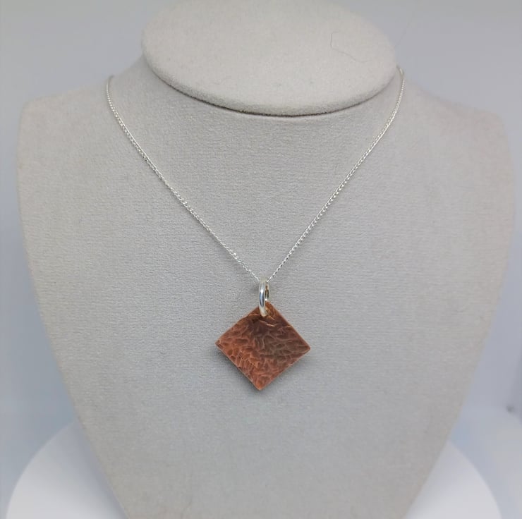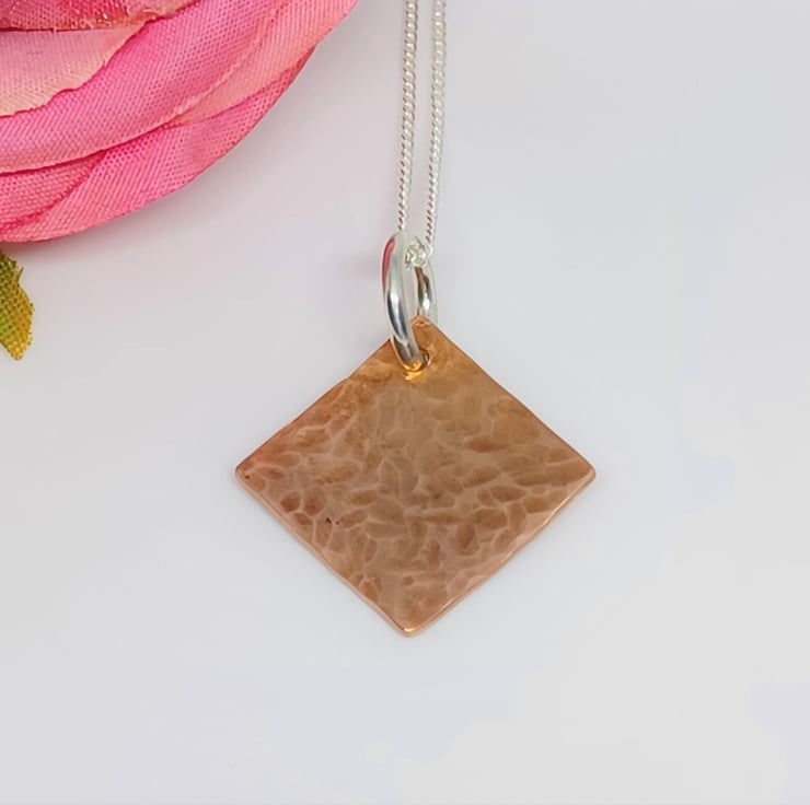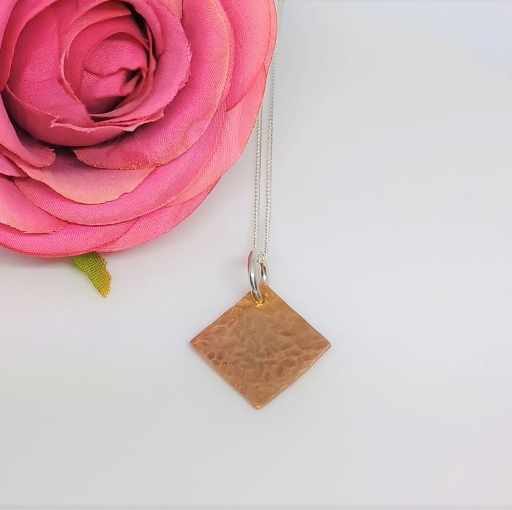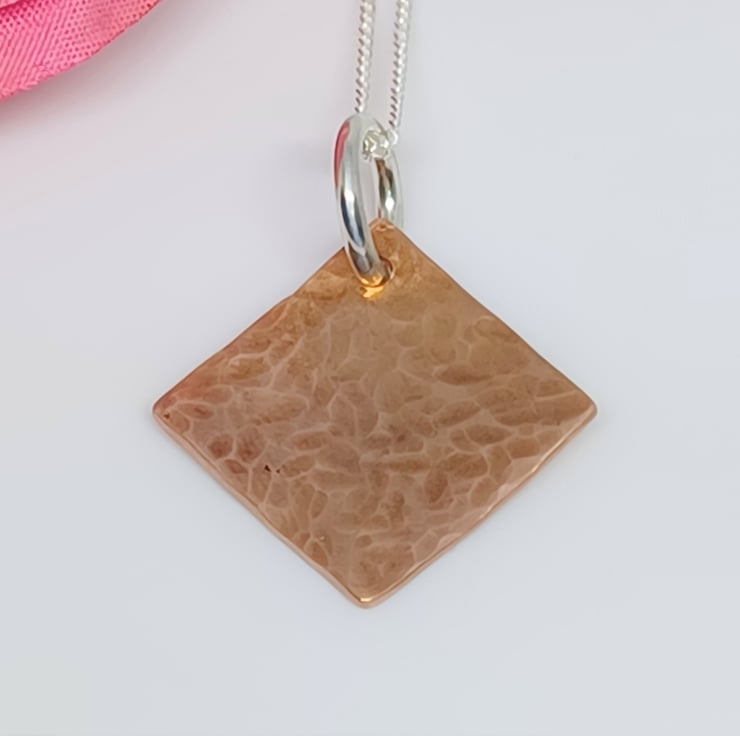 This pendant features a copper diamond, with a hammered texture added. The diamond measures approx. 15mm.
