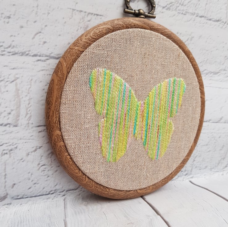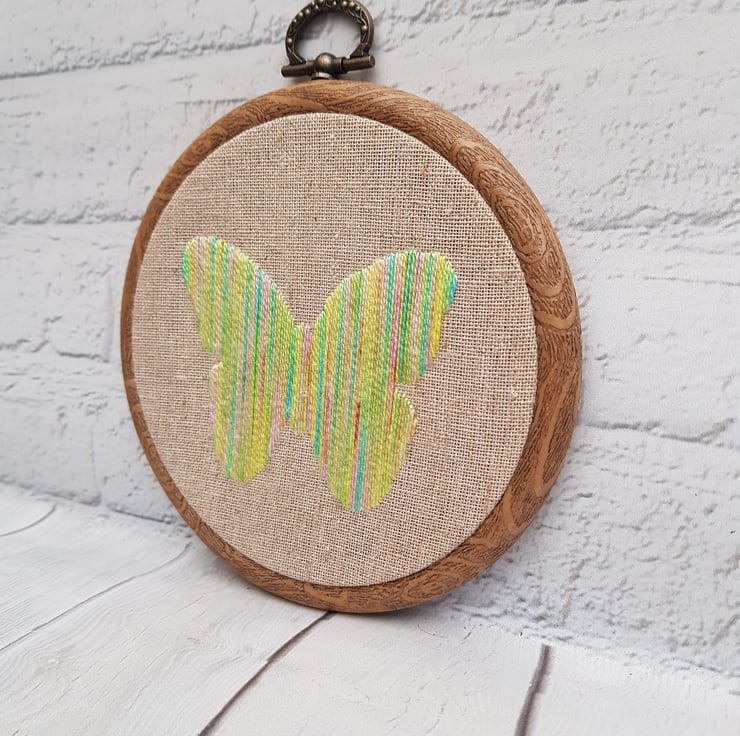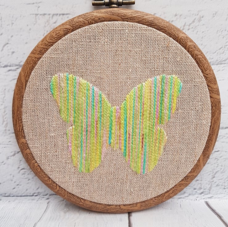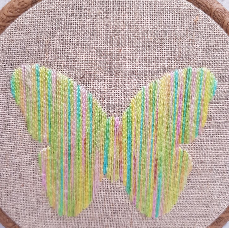 This pretty butterfly is hand embroidered on to a hessian backing, using beautiful variegated threads in shades of yellow, with touches of blue, green and pink, which give the most beautiful texture, and sheen.