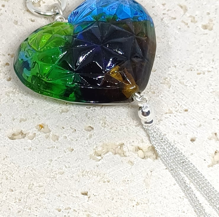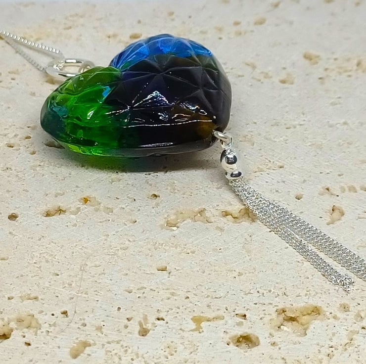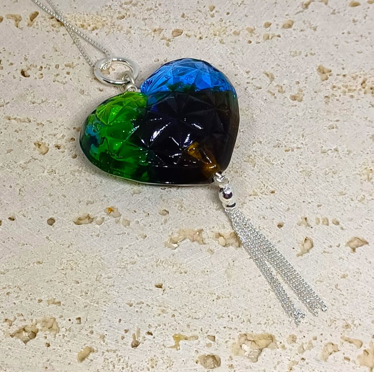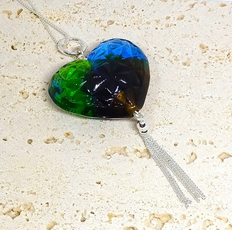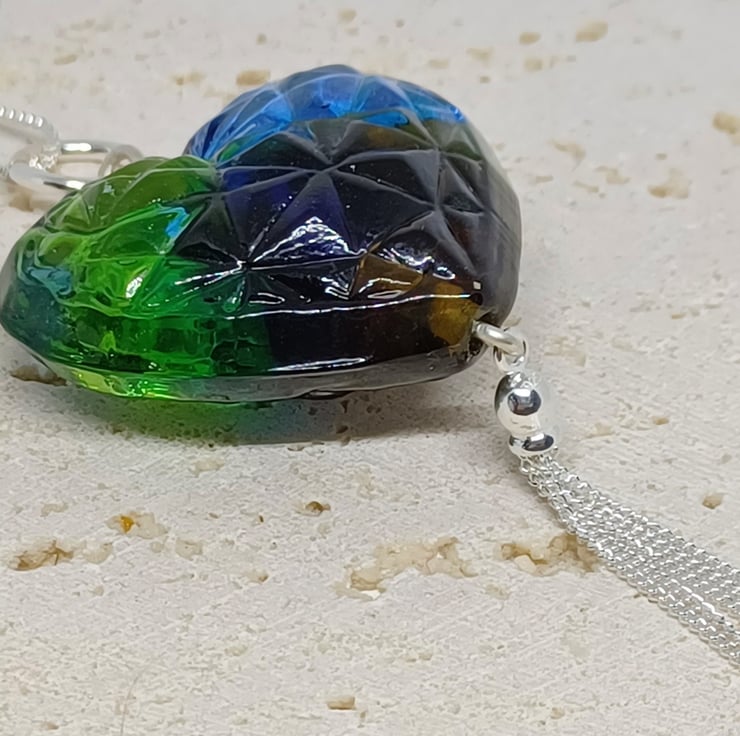 Blue and Green Lampwork Glass Heart This beautiful necklace has been made from my stash of lampwork glass hearts. It has been combined with sterling silver findings, and finished with a Sterling Silver tassel to make a real statement. The heart measures approx 4cm across.