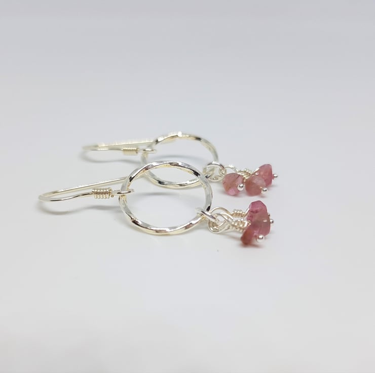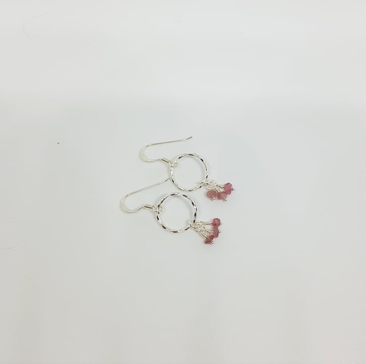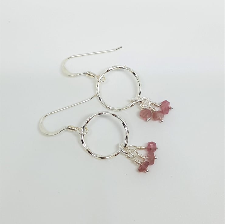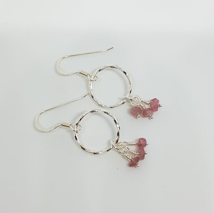These earrings have tiny pink faceted Tourmalines suspended below textured sterling silver rings. Suspended on sterling silver earwires.