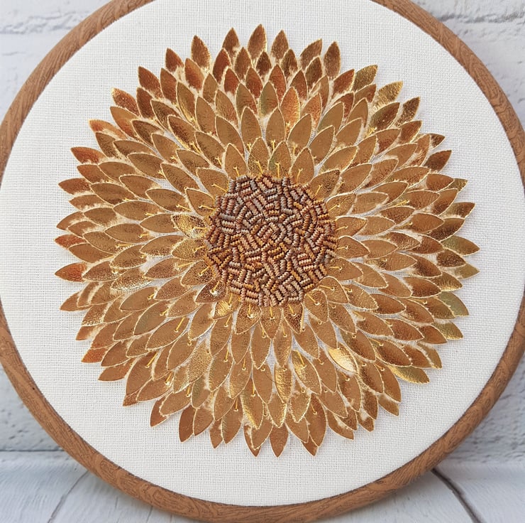 The sunflower has petals of gold kid leather, which are sewn individually on to the linen base. The centre is made up of tiny sections of goldwork wires in lovely burnished gold shades.