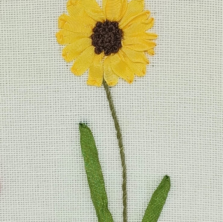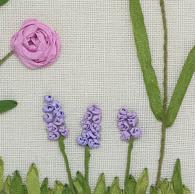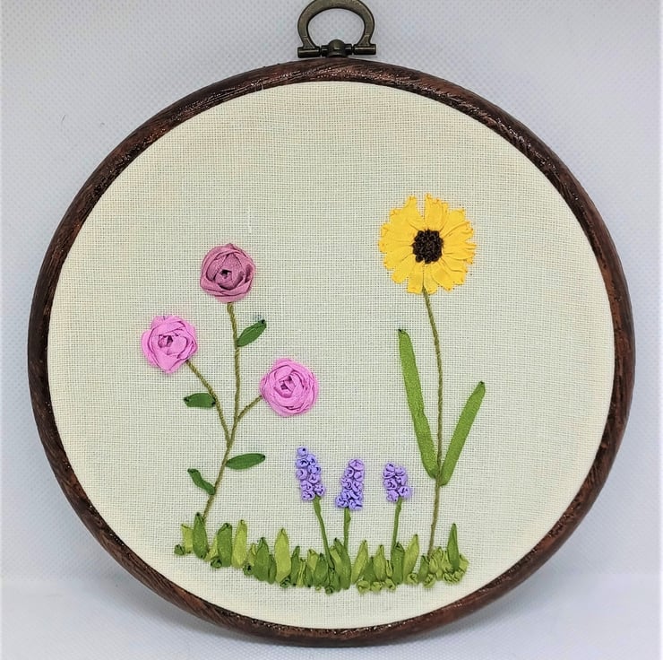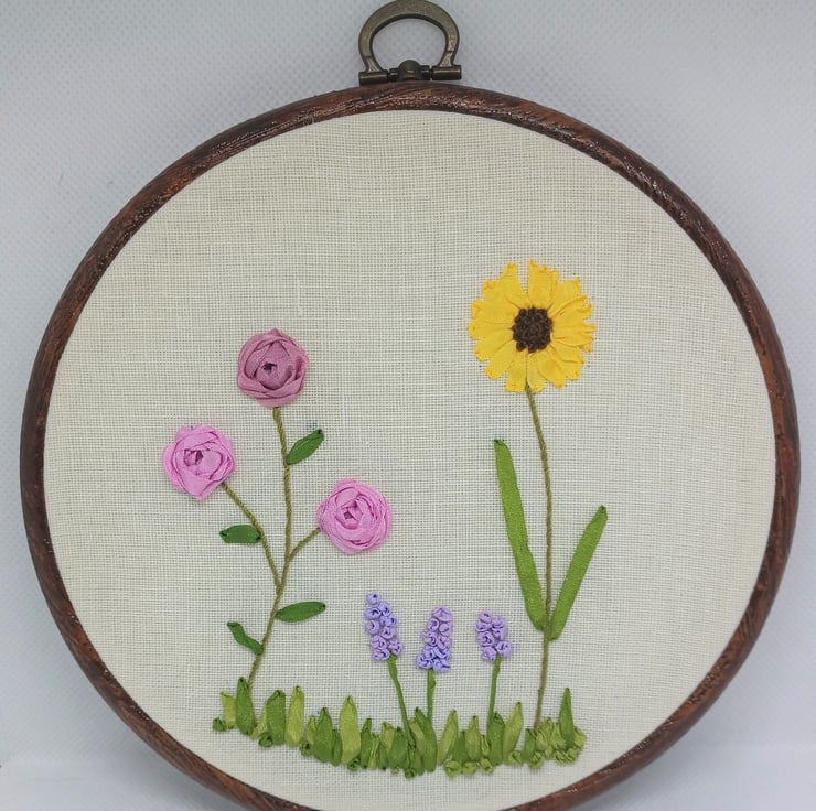 The Wild flower hoop is completely hand embroidered using silk ribbons, on to a white silk base.