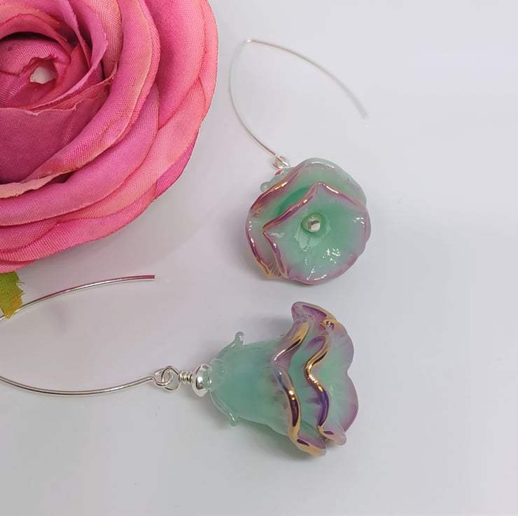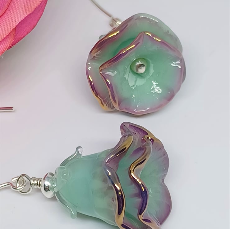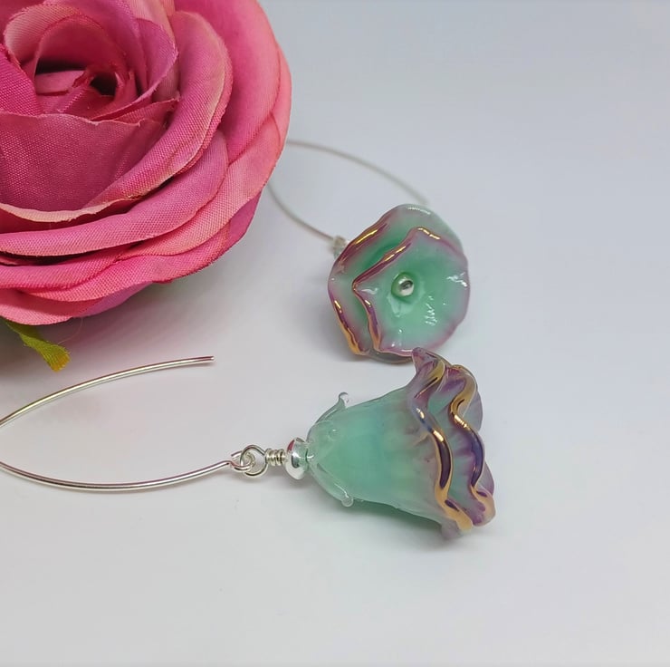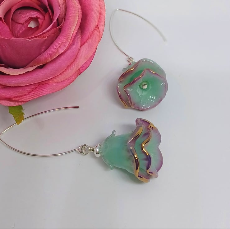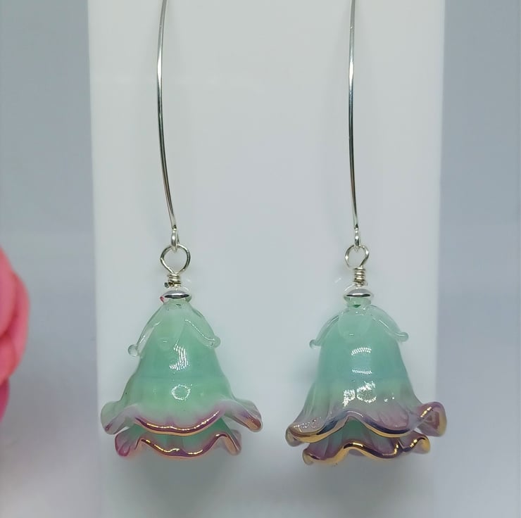 These earrings make a real statement! They feature lampwork glass bell flower shaped beads in a gorgeous mint green colour, with purple edge finished with a touch of gold, and with a tiny pearl as stamen. They are long - The sterling silver earwire is just over an inch, and the glass flower approximately 1 inch.