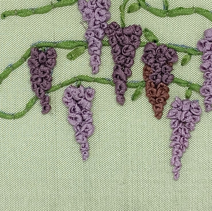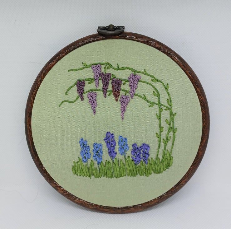 The Wisteria flower hoop is completely hand embroidered using silk ribbons, on to a green silk base.