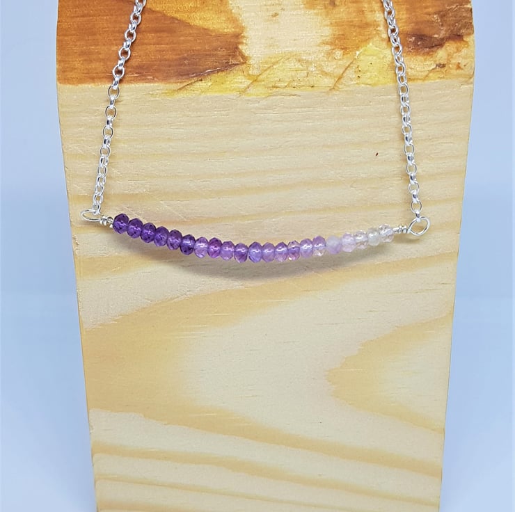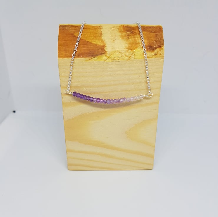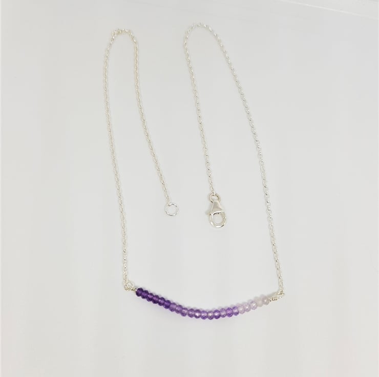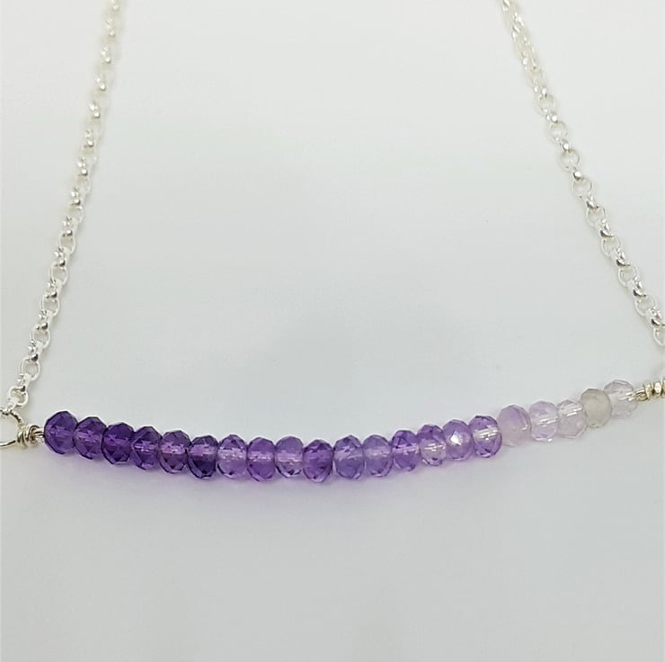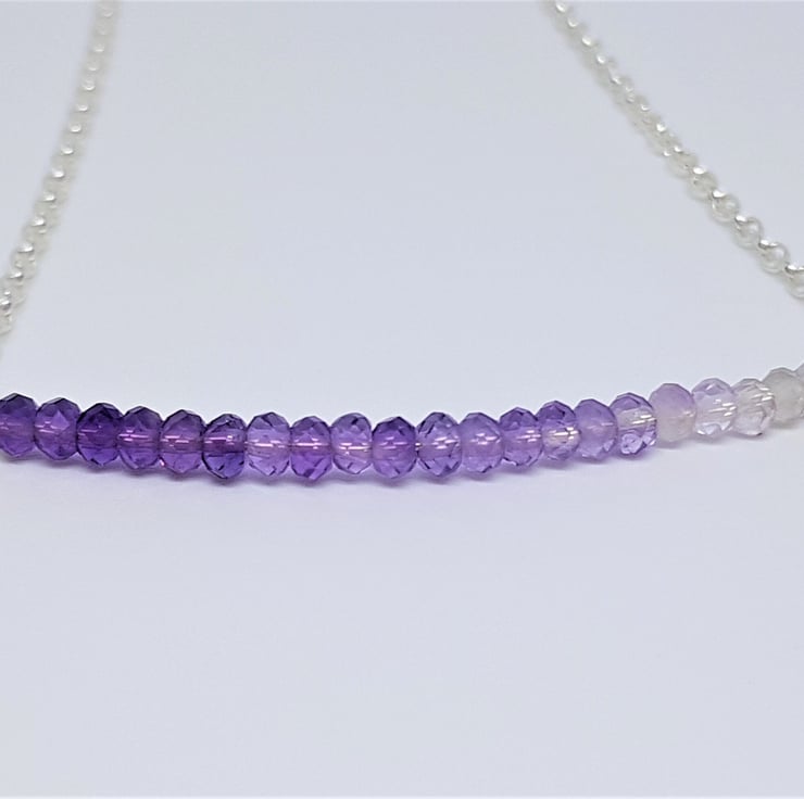This necklace features a series of faceted Amethyst rondelle beads, in differing shades which create an ombre effect. They are set into sterling silver chain to form the necklace. The Amethysts are approximately 2-3mm each. The necklace measures approximately 18 inches in total