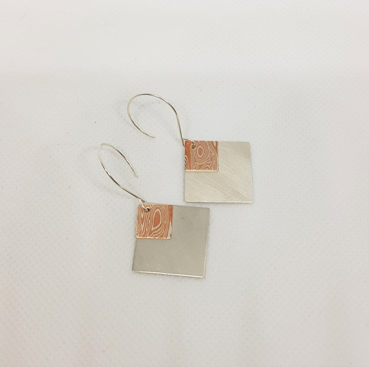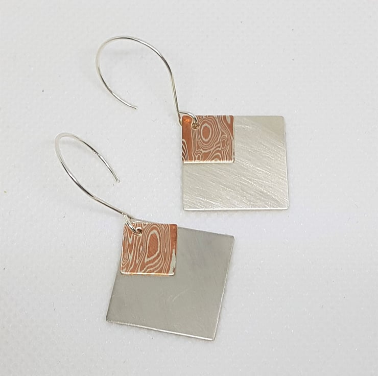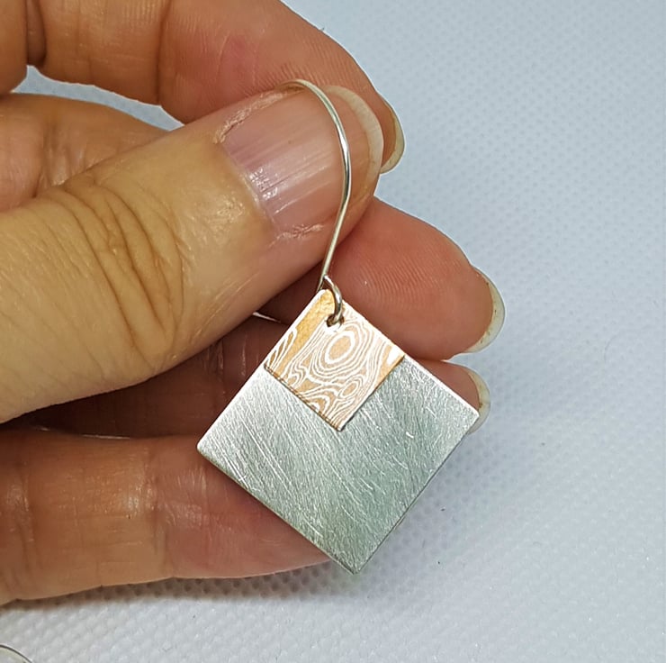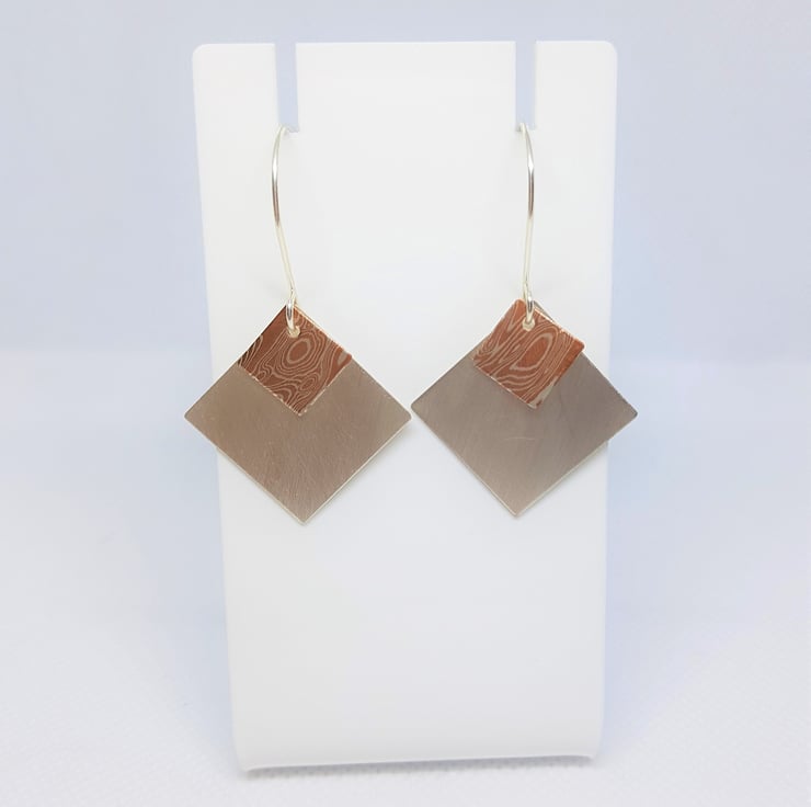 These new earrings feature sterling silver diamond shapes, overlaid with a diamond shape of Mokume Gane.