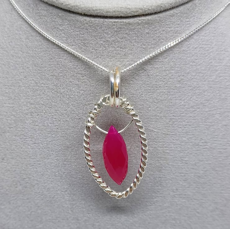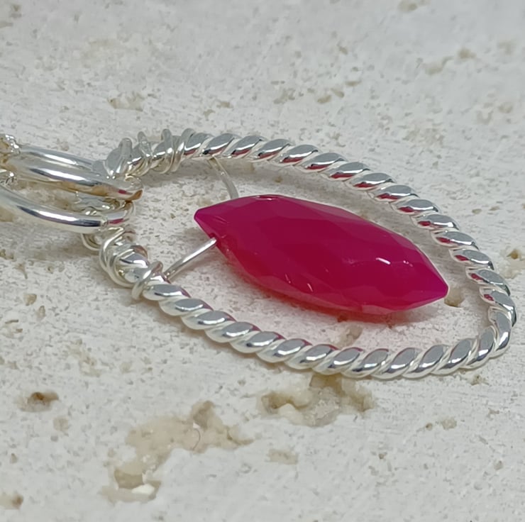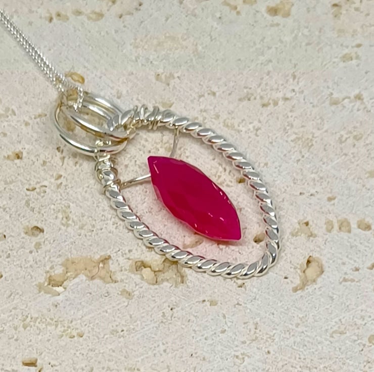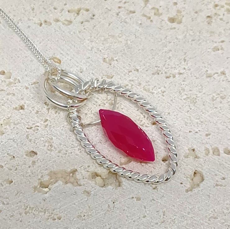 This is a new style of pendant, featuring a bright pink Chalcedony gemstone which has been wired on to a textured sterling silver ovals, so that it drops in the centre.