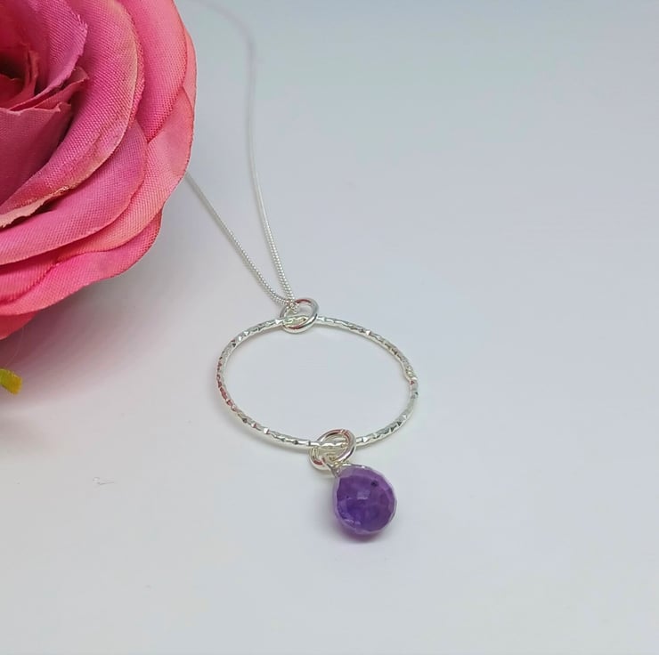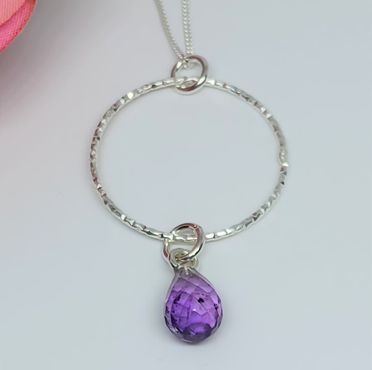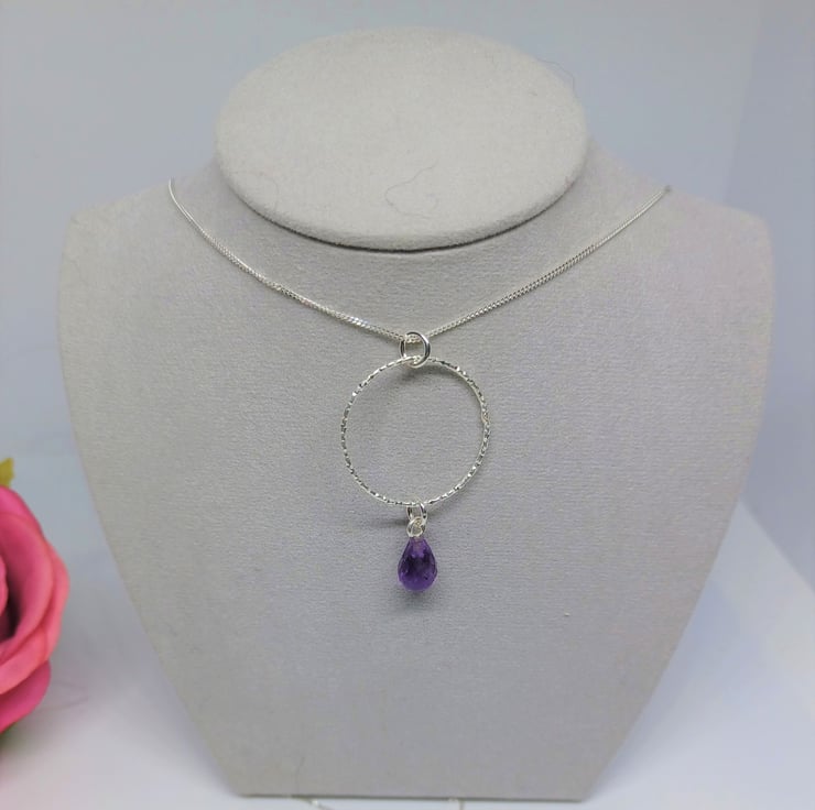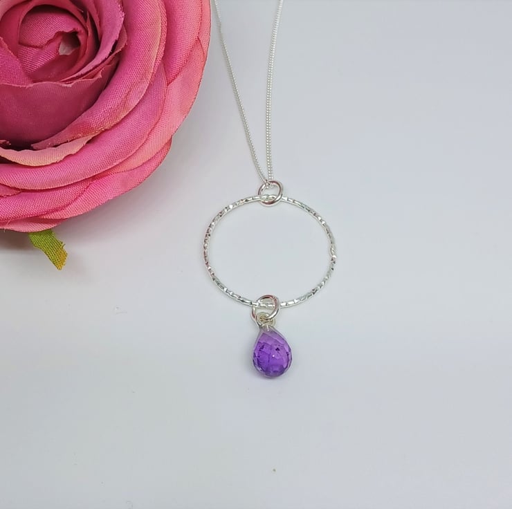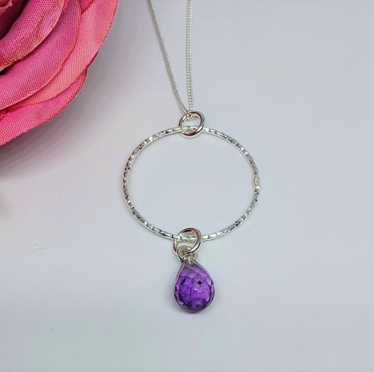 Faceted Purple Amethyst Teardrop and Sterling Silver Sparkly Hoop Pendant, Amethyst and Silver Necklace