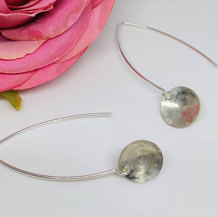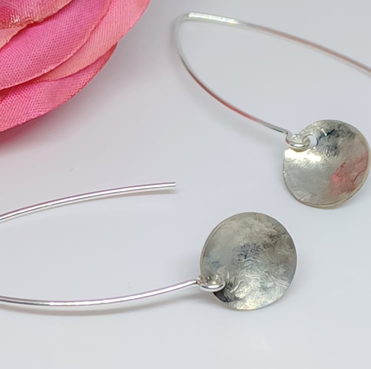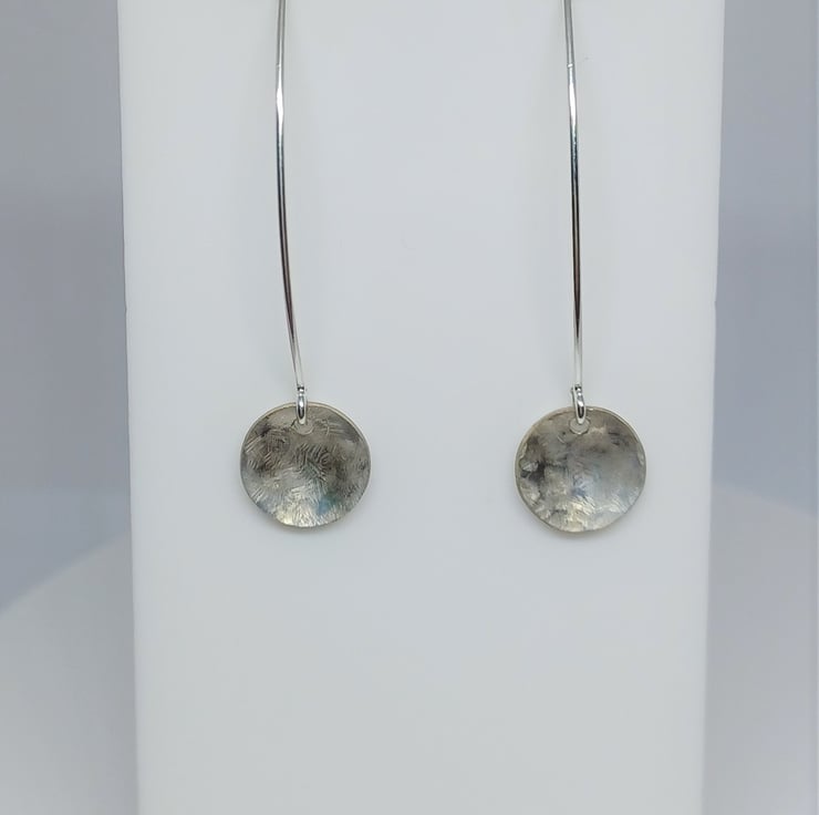 A small sterling silver disc which has had a hammered texture applied using traditional tools and techniques. They are suspended from shaped sterling silver earwires, which give them that lovely drop. The silver discs measure approx. 10mm