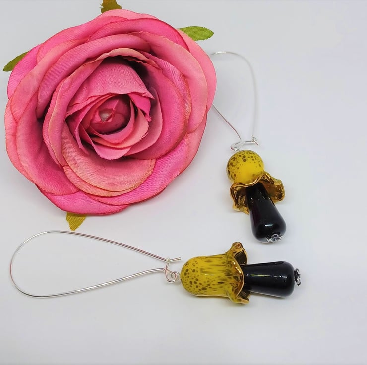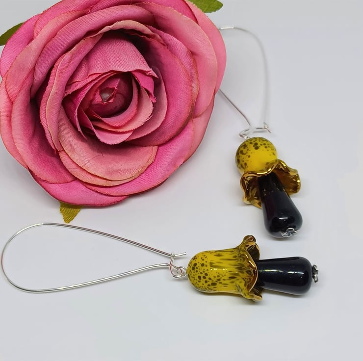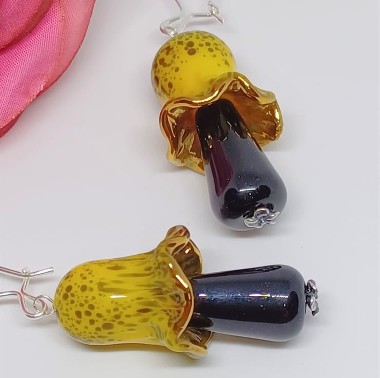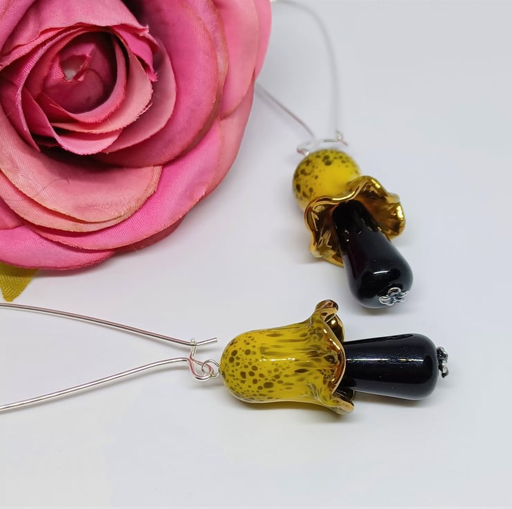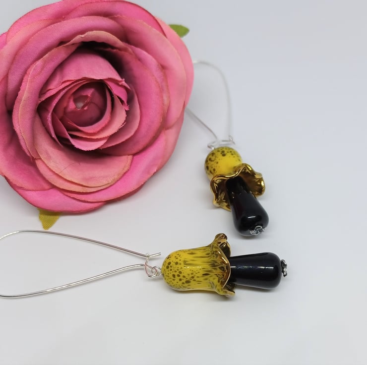 These earrings make a real statement! They feature lampwork glass mushroomtoadstool shaped beads in a gorgeous yellow and black. The top and bottom sections are separate to allow some movement. They are long - The sterling silver earwire is approximately 2 inches, and the glass mushroom approximately 1.5 inches.