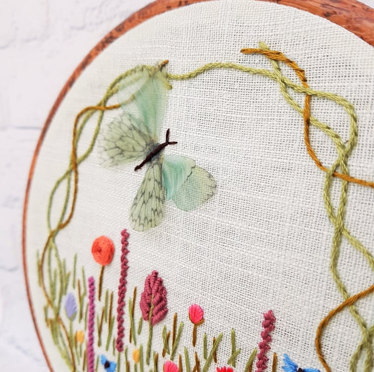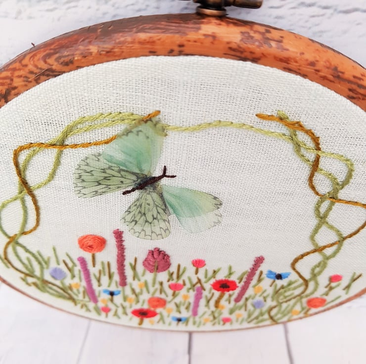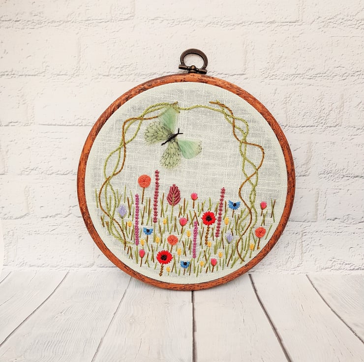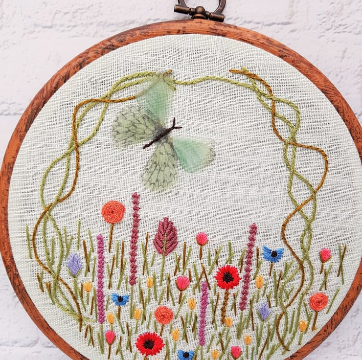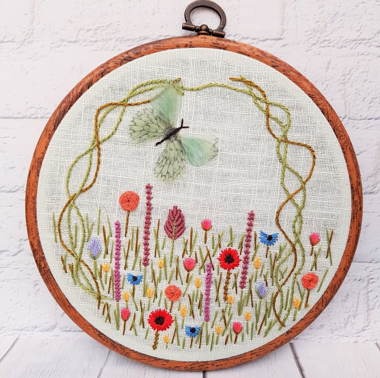 This pretty hoop is full of hand embroidered wildflowers, and greenery and the design is finished off with the addition of pretty green organza butterflies - the wings stand proud of the fabric to add depth and texture. This is stitched completely freehand, so is OOAK!