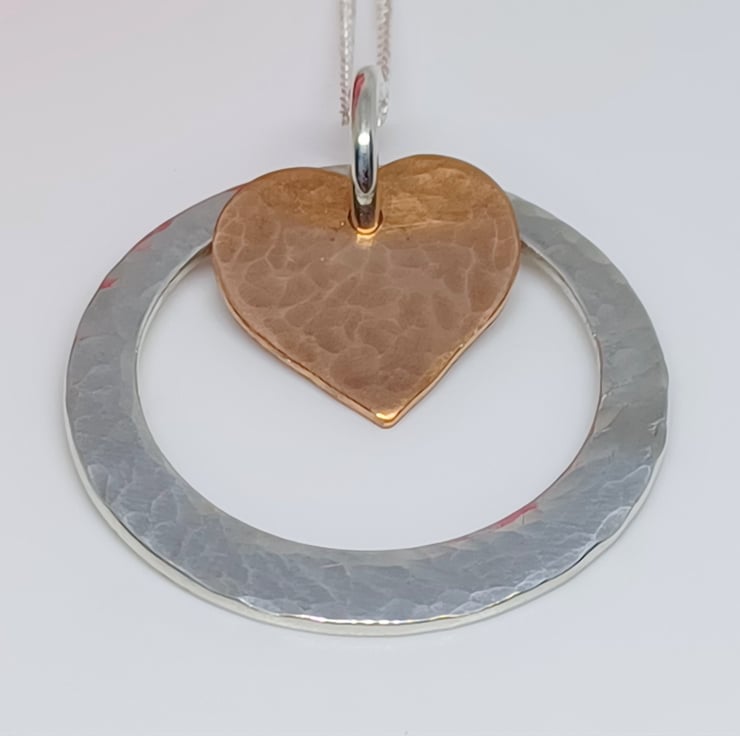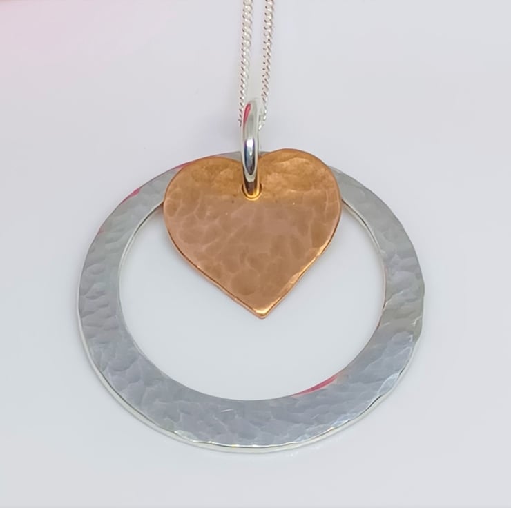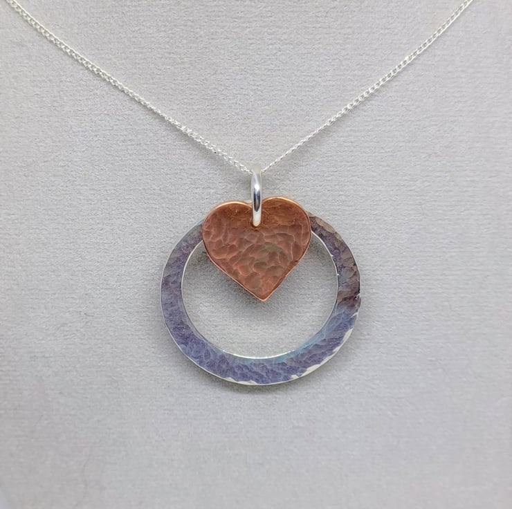 Hammered Copper Heart and Hammered Sterling Silver Washer Hoop Pendant, Copper and Silver Pendant, Copper and Silver Necklace