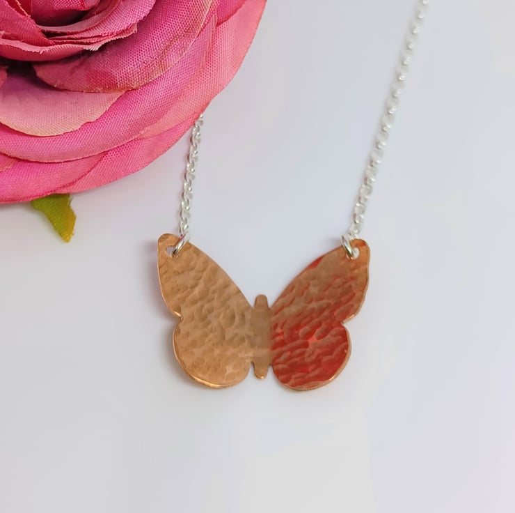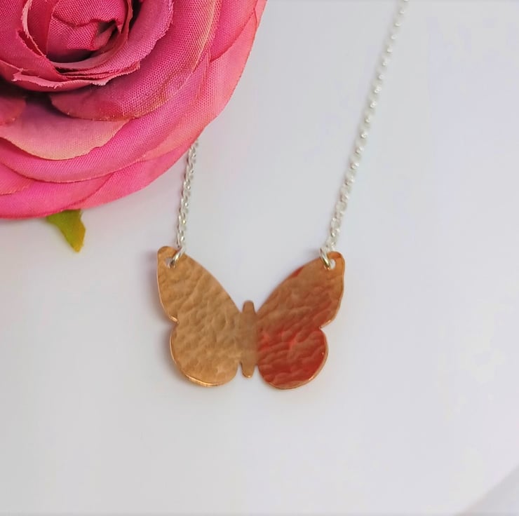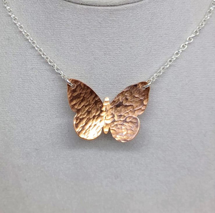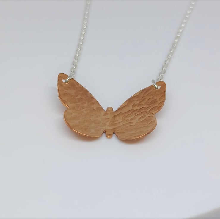 This copper butterfly has been hammered to give a lovely texture, and the wings shaped to give a 3D effect. Finished with a sterling silver chain. The complete necklace measures approx. 18 inches, and the copper butterfly is approx. 20mm.