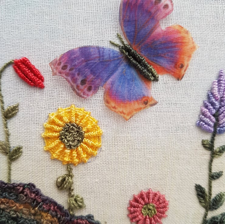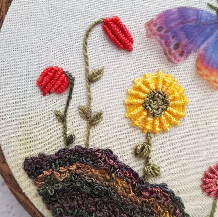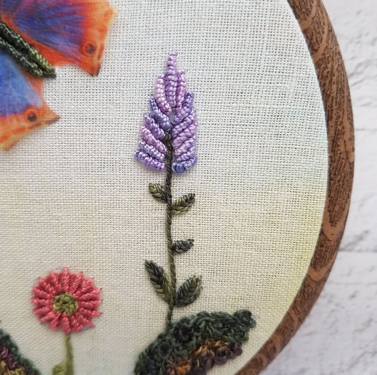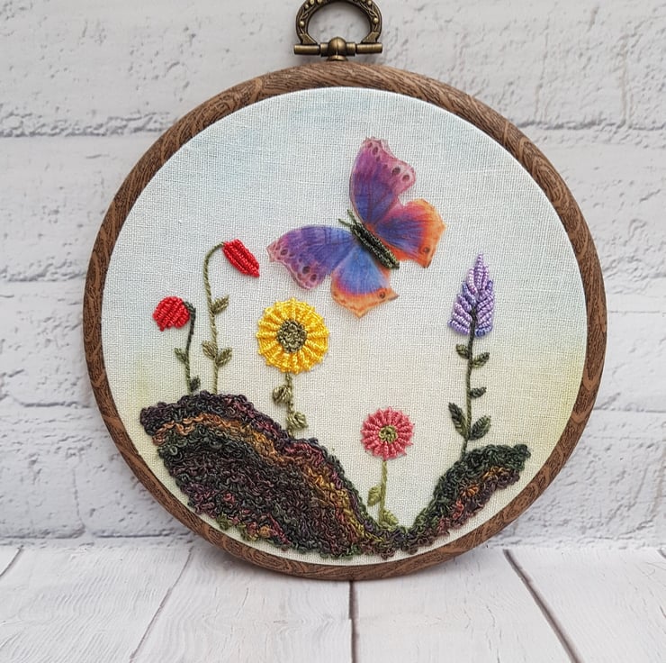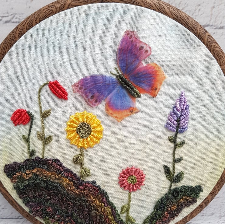 This pretty hoop is full of hand embroidered wildflowers, and greenery and the design is finished off with the addition of a pretty purple and orange organza butterfly - the wings stand proud of the fabric to add depth and texture. This is stitched completely freehand, so is OOAK!