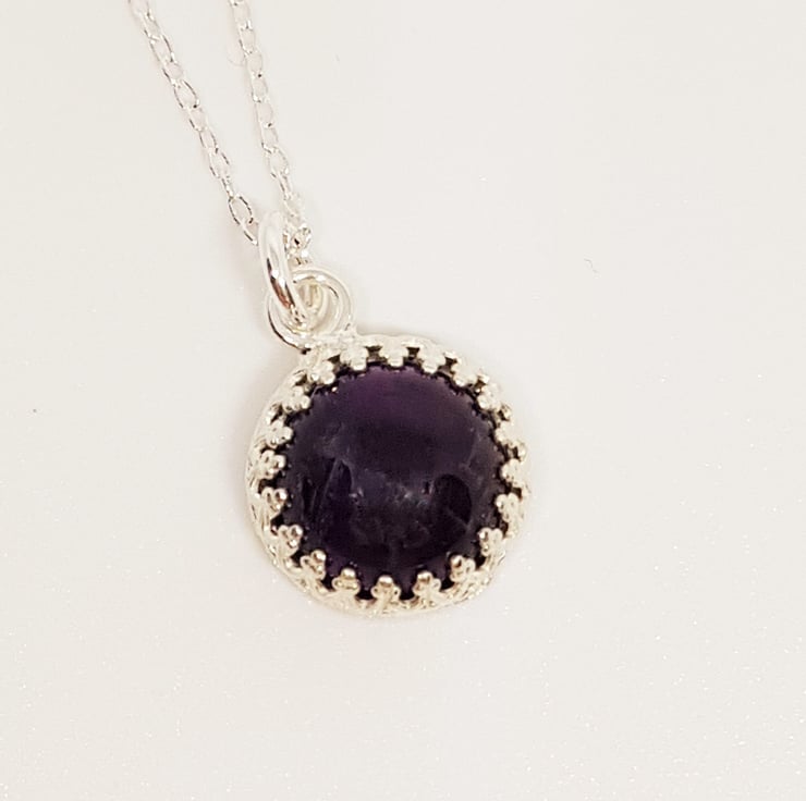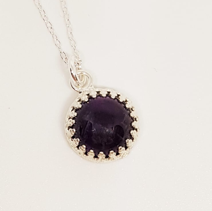 A beautiful dark purple amethyst cabochon is surrounded by a sterling silver gallery wire setting. The pretty silver is gently manipulated over the cabochon to hold it firmly in place. The cabochon measures approximately 10mm.