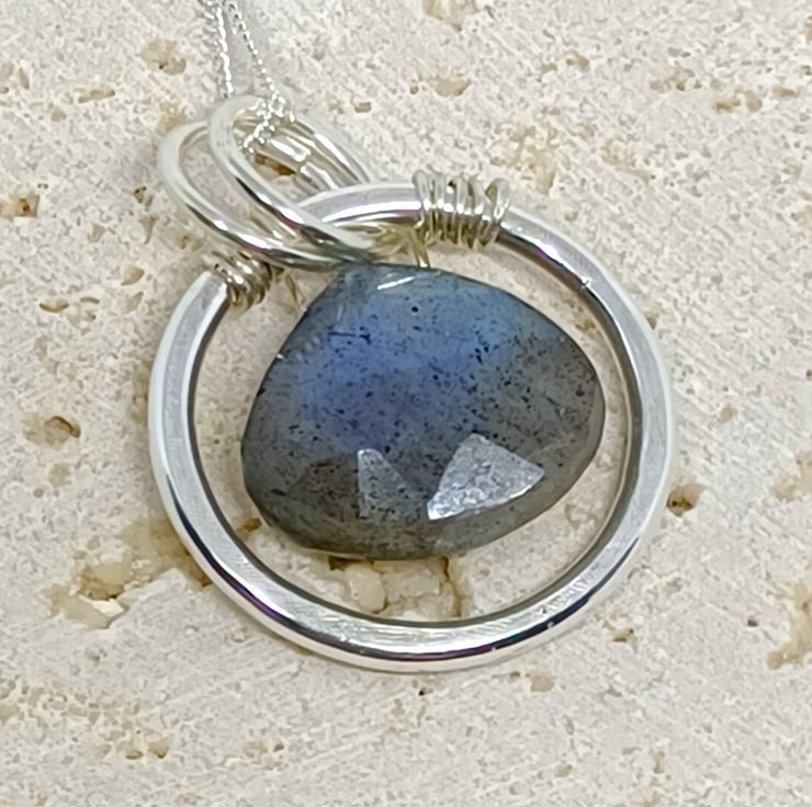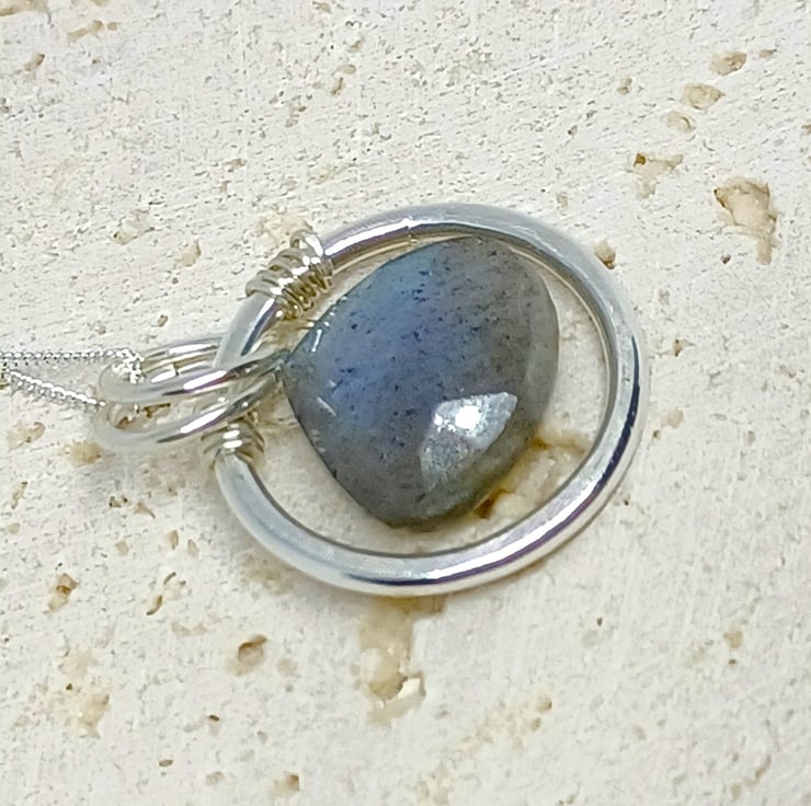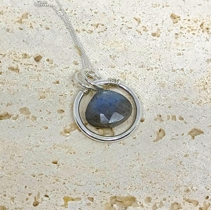 This is a new style of pendant, featuring a beautiful Labradorite gemstone teardrop, which has blue flashes of colour. The Labradorite has been wired on to a substantial sterling silver ring, so that it drops in the centre.