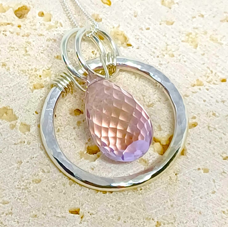 This is a new style of pendant, featuring a beautiful Ametrine gemstone teardrop, which has amazing flashes of colour. The Ametrine has been wired on to a substantial sterling silver ring, which has had a hammered texture added, so that it drops in the centre.