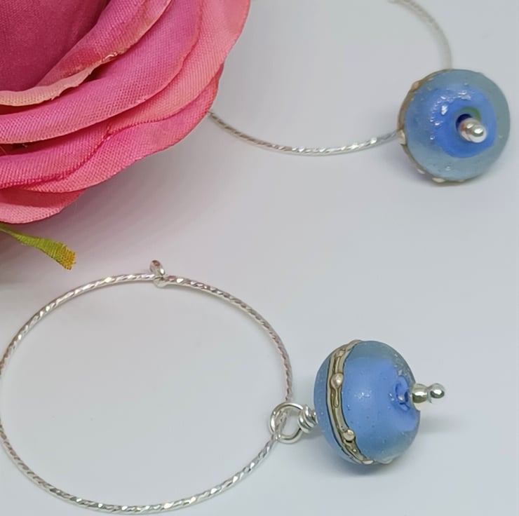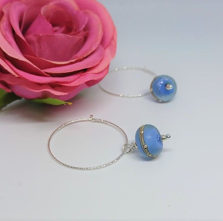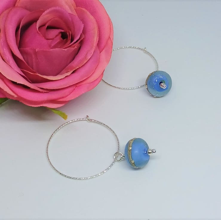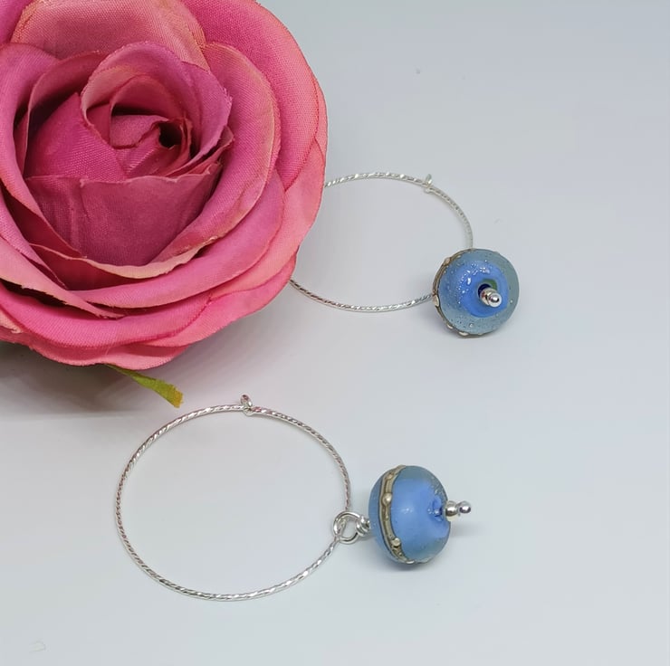 Sterling silver sparkly hoops have lampwork glass galaxy style drops. This listing is for the blue pair shown on the main pictures. The last two photos show other colours available in my shop - they are not included in this listing. The hoops measure approx. 30mm.