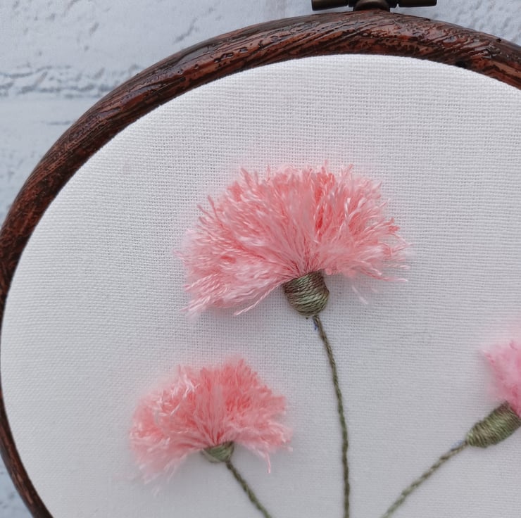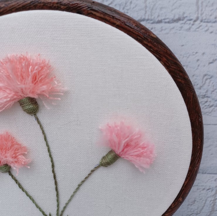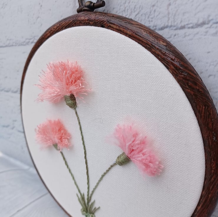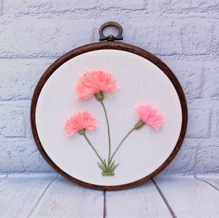 Fluffy pink dandelions are hand stitched using silk threads, on to a white silk backing, and framed in a 5" hoop.