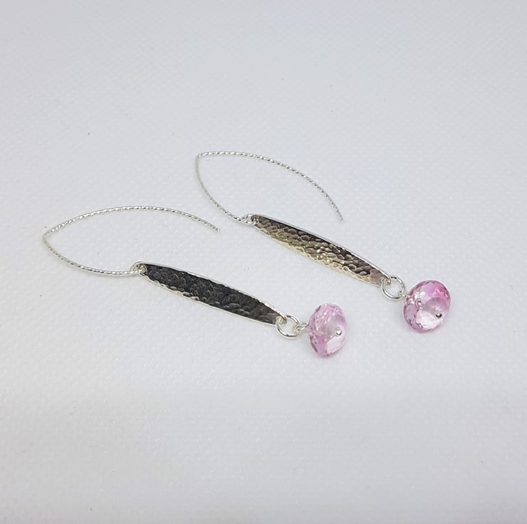 Gorgeous faceted Pink Topaz disc beads hang below a hammered texture sterling silver lozenge. They are suspended from diamond cut silver earwires, which give them that lovely sparkle.