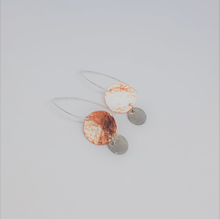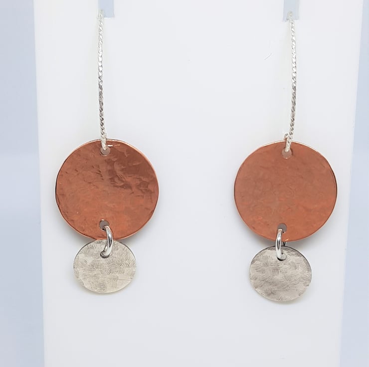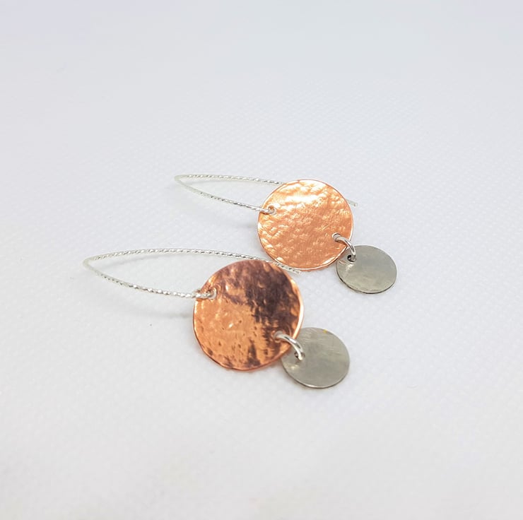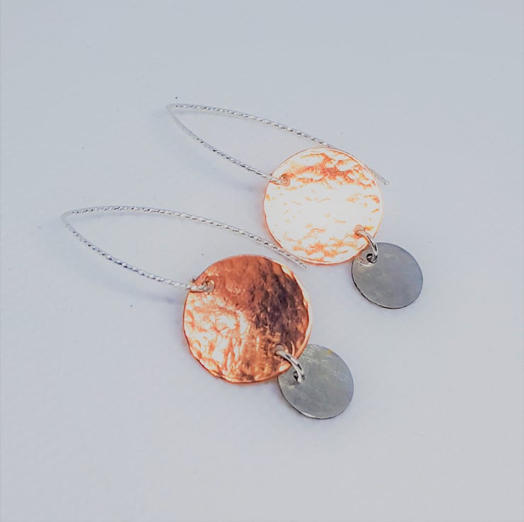 A larger copper disc which has had a hammered texture applied using traditional tools and techniques, suspended above hammered texture sterling silver discs. They are suspended from diamond cut silver earwires, which give them that lovely sparkle.