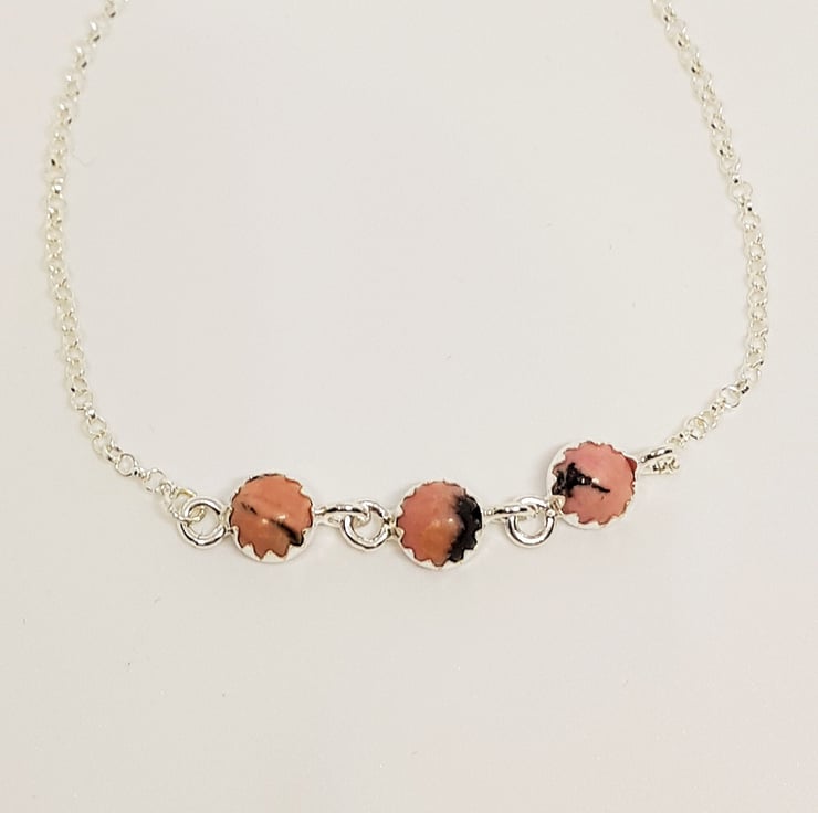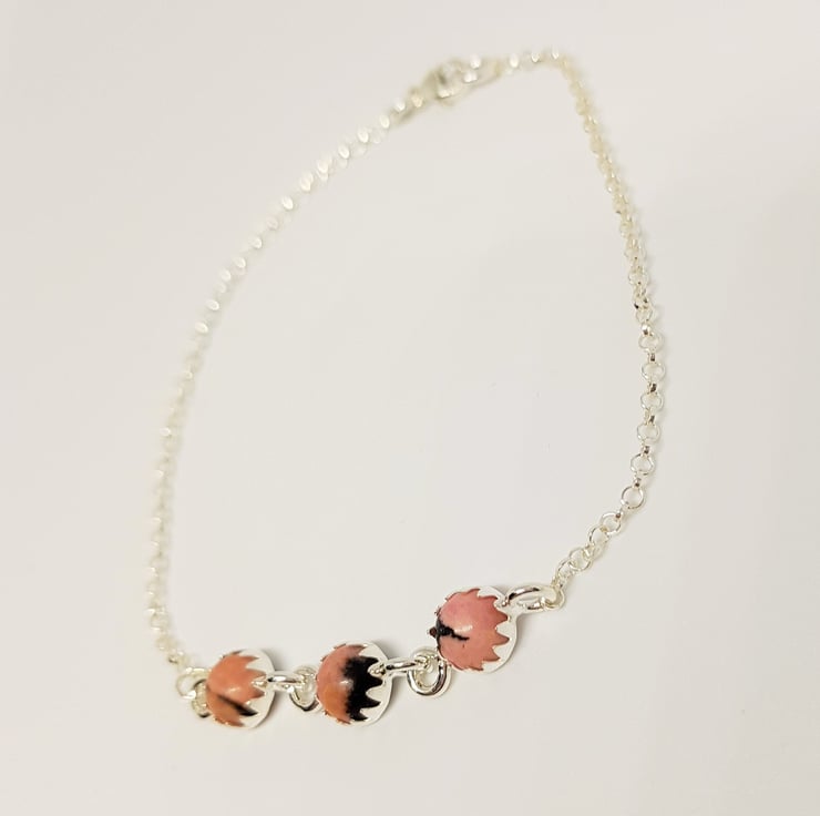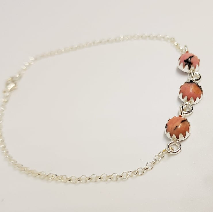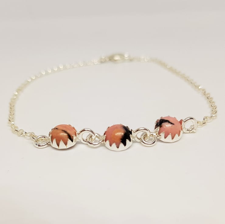 A trio of Rhodonite cabochons are set in silver to form this pretty sterling silver bracelet.