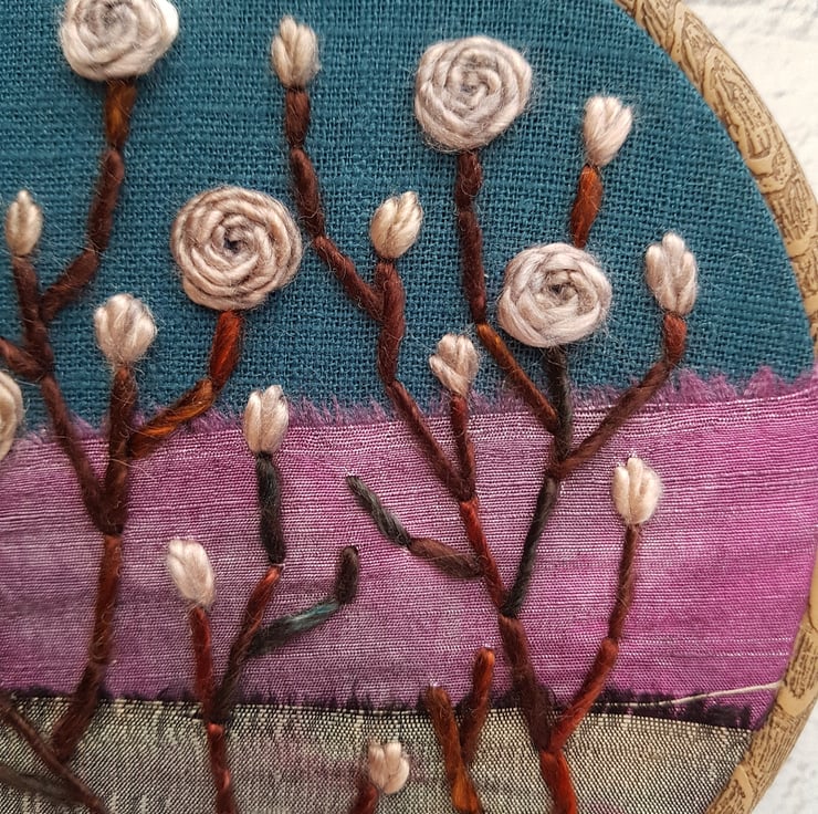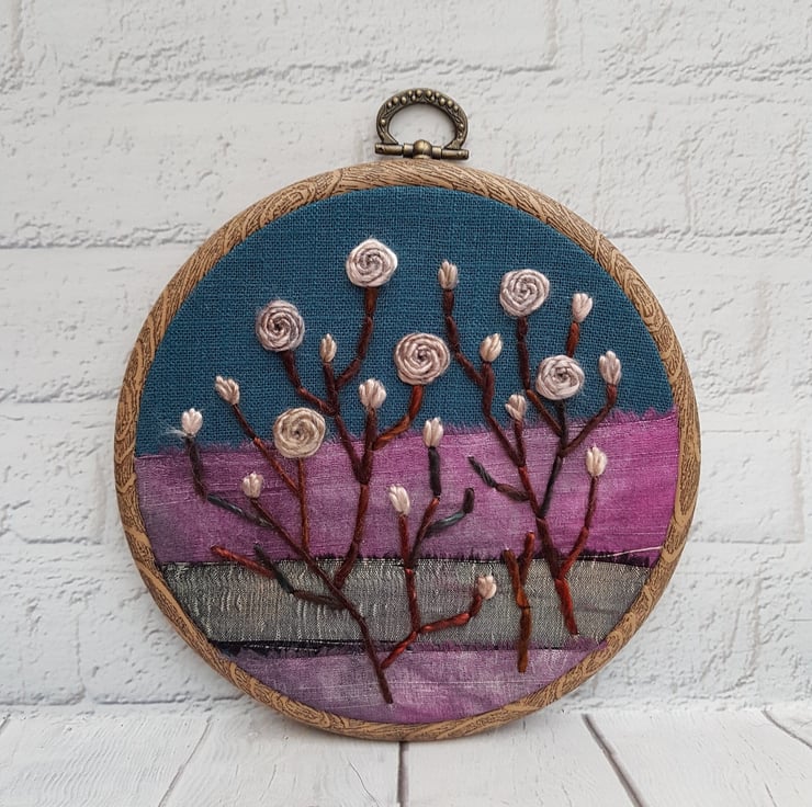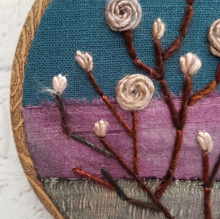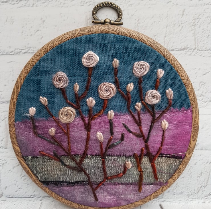 This pretty hoop is completely hand embroidered on to a vintage layered silk background, using some very lovely hand dyed threads.