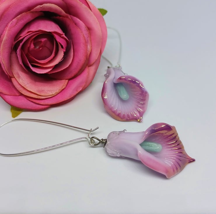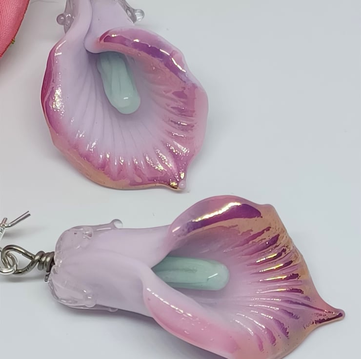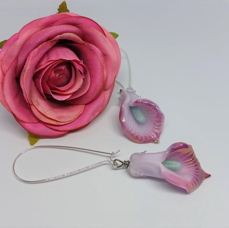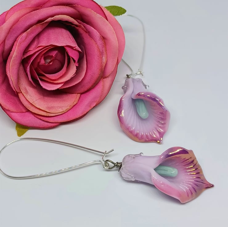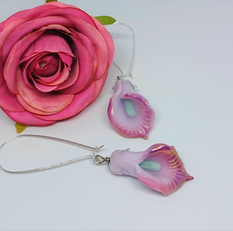 These earrings make a real statement! They feature lampwork glass lily shaped beads in a gorgeous light purple colour, with darker purple edge, and mintblue stamen. They are long - The sterling silver earwire is approximately 2 inches, and the glass lily approximately 1.5 inches.