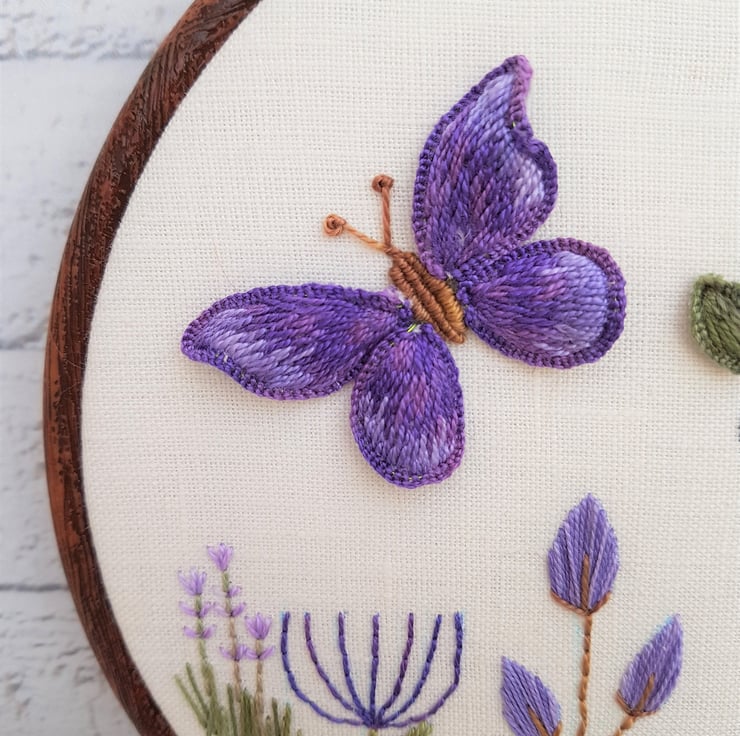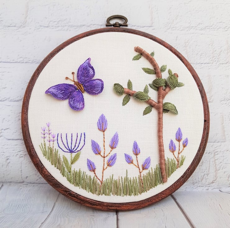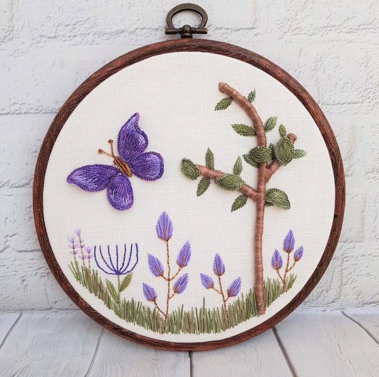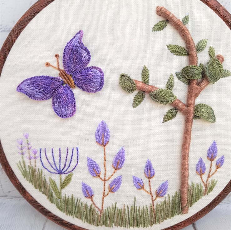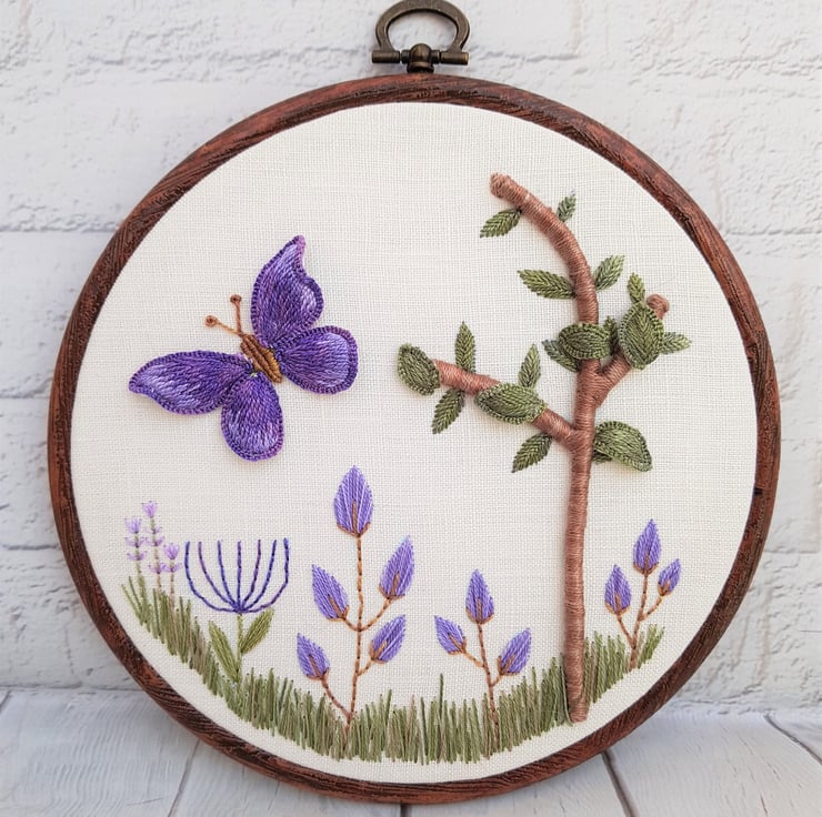 The tree has a 3D base, with stumpwork leaves, and the butterflies wings are also stumpwork, so they stand up from the fabric base. Stumpwork is a traditional form of embroidery, which utilises wire slips to create individual elements, which can be shaped, and added to a base piece.