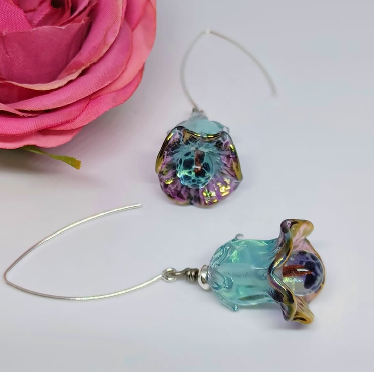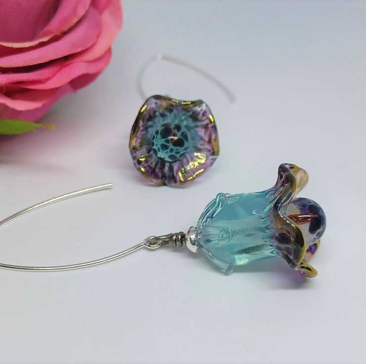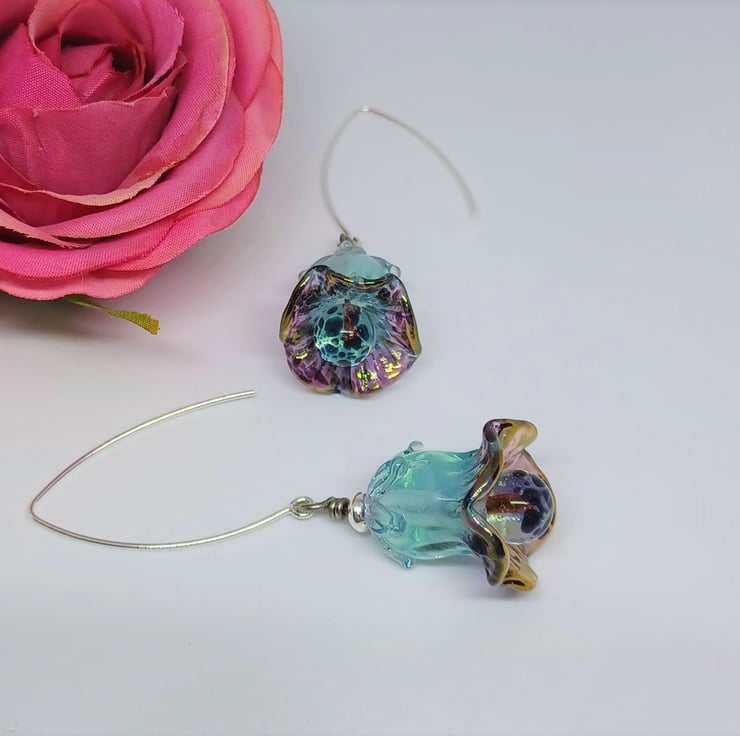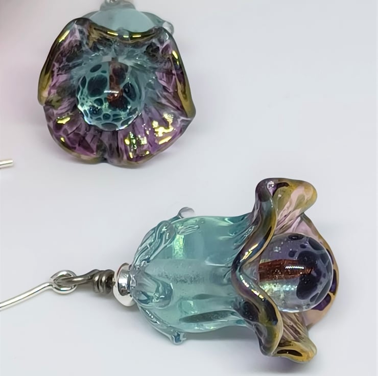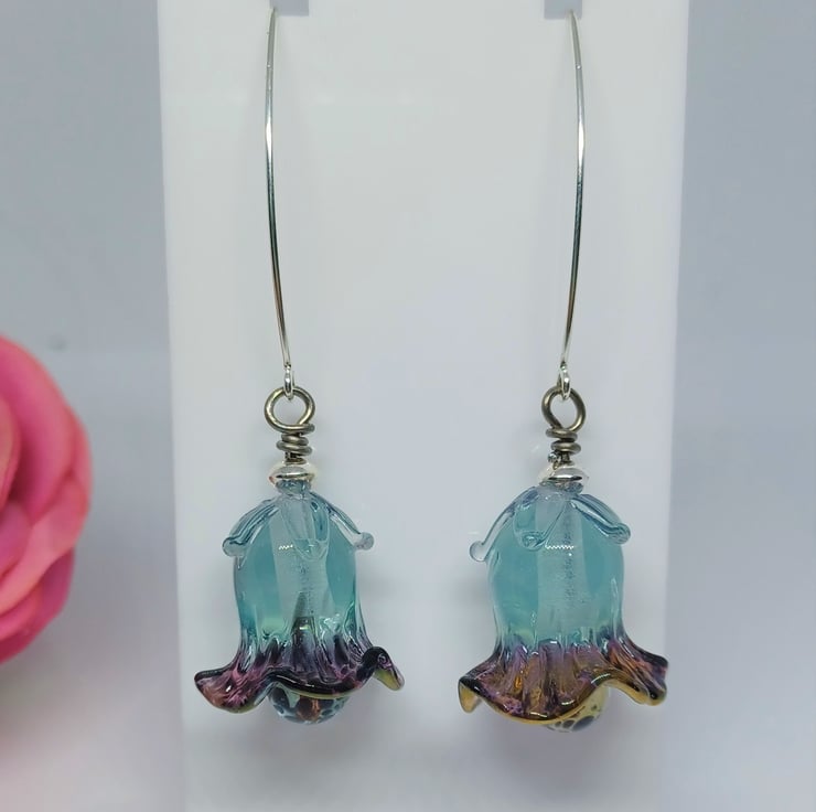 These earrings make a real statement! They feature lampwork glass bell flower shaped beads in a gorgeous blue colour, with purple edge finished with a touch of gold, and with a blue and black mottled glass stamen. They are long - The sterling silver earwire is just over an inch, and the glass flower approximately 1 inch.