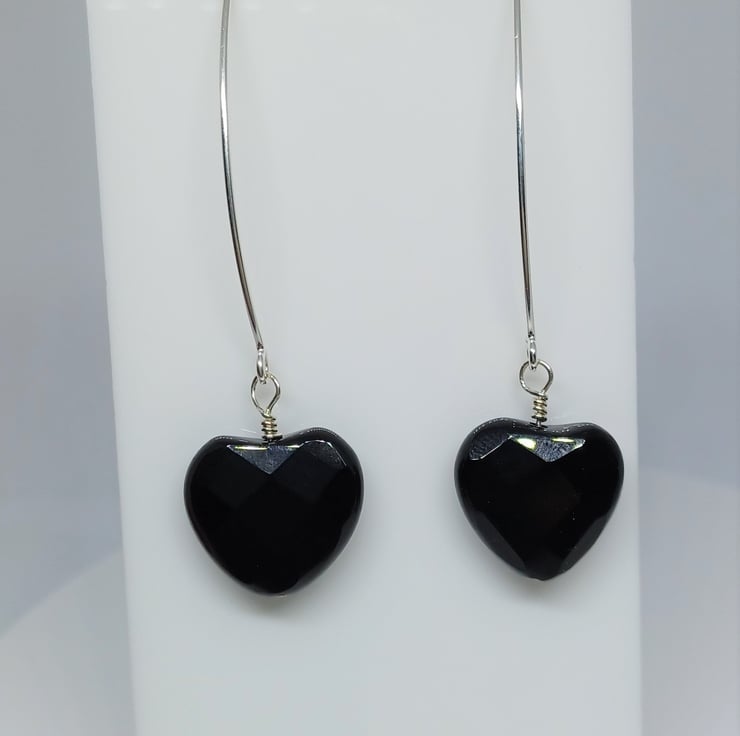Featuring faceted black agate gemstone hearts. The lovely, shaped earwires finish them perfectly, and are just a nice length. They drop nicely, but aren t too bulky!