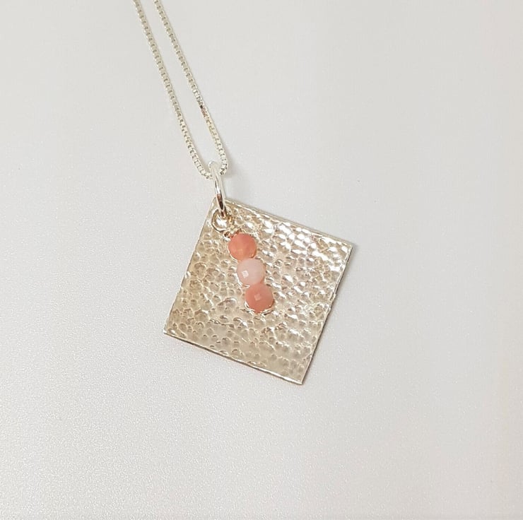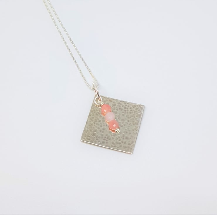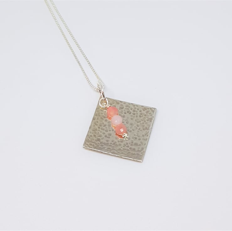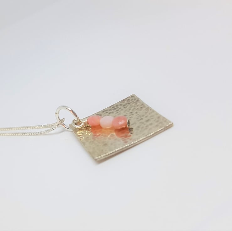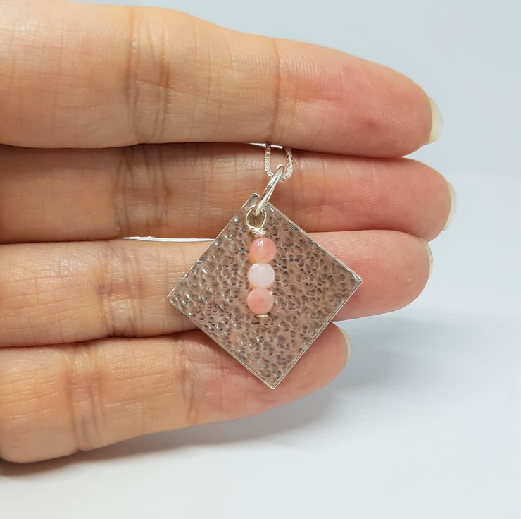 This new pendant features a sterling silver diamond, with a hammered texture with a trio of faceted Pink Opal coin beads added. The pendant was created using traditional silversmithing tools and techniques.