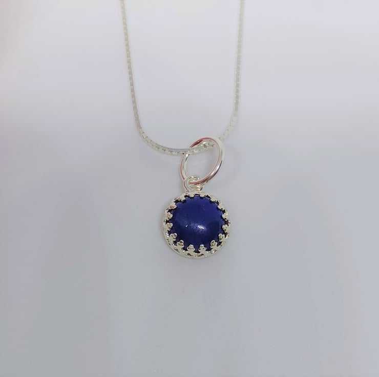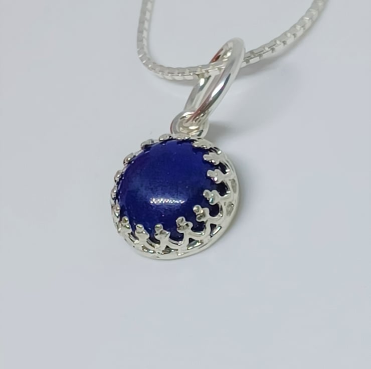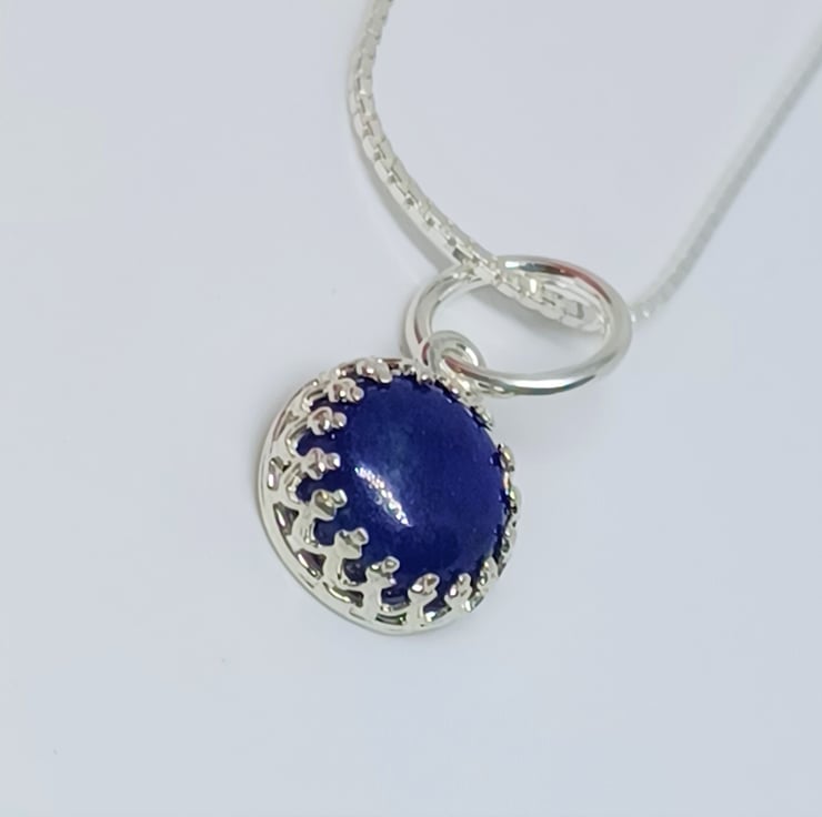 This simple, but very pretty pendant features a gorgeous blue Lapis Lazuli cabochon, set into a beautiful fancy gallery wire surround. The simplicity of this style really allows the beauty of the lapis to shine through. The cabochon measures approximately 8mm