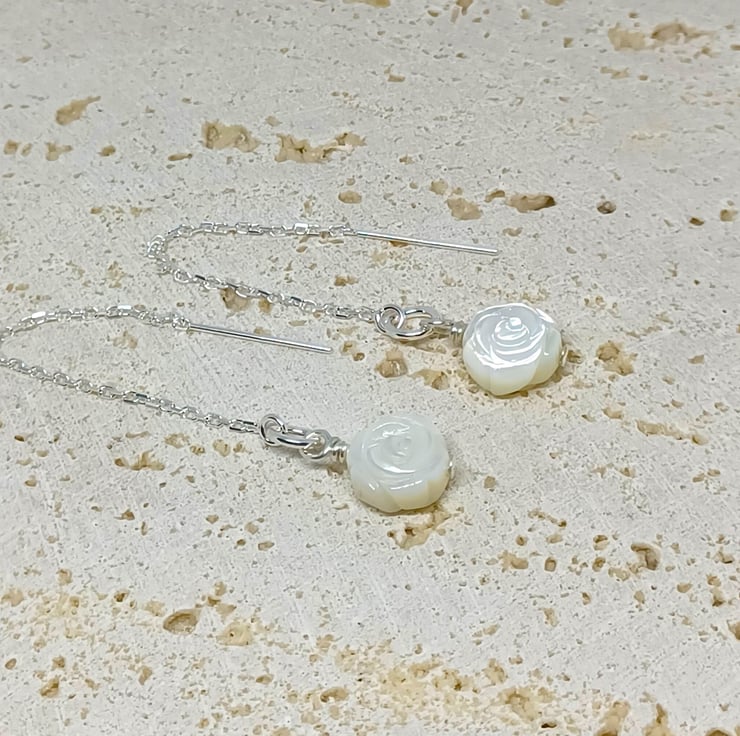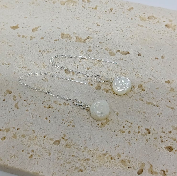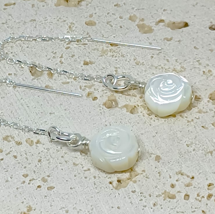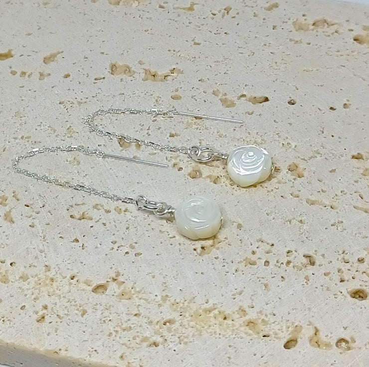 These earrings are in my favourite thread through style the sterling silver earwires feature beautiful carved mother of pearl (MOP) roses.