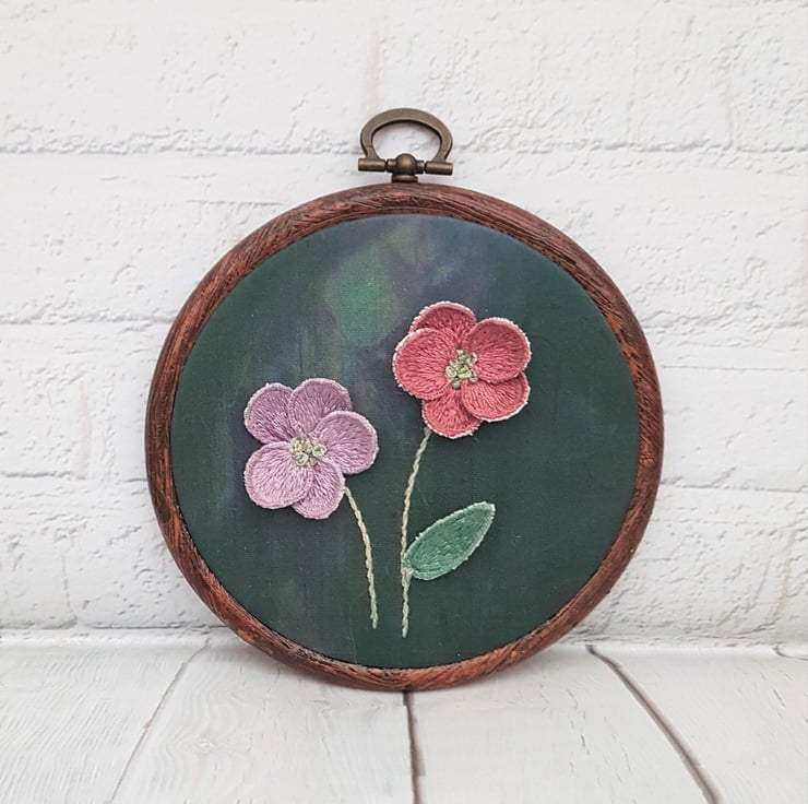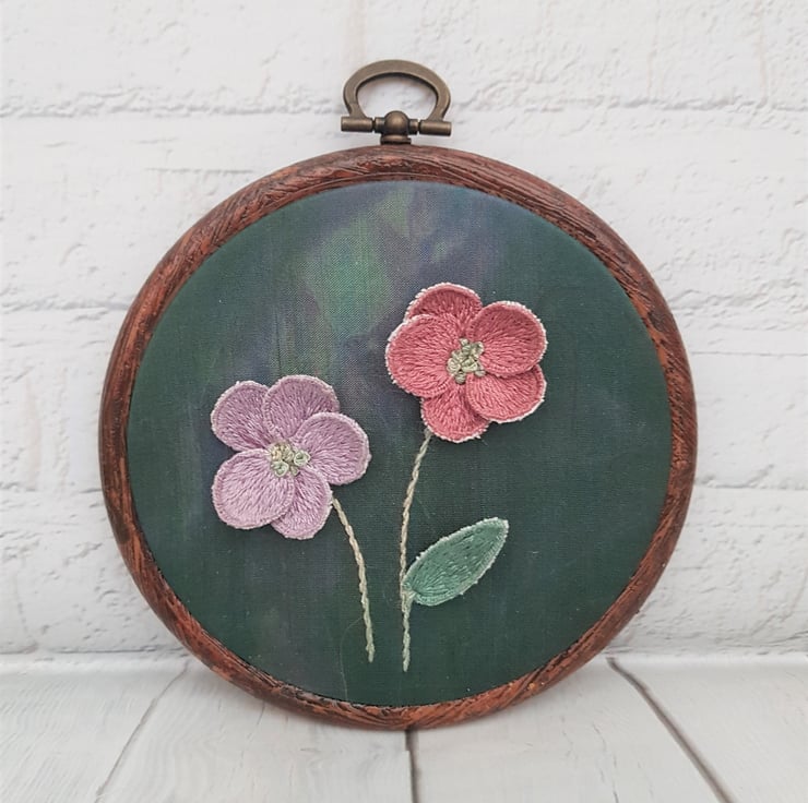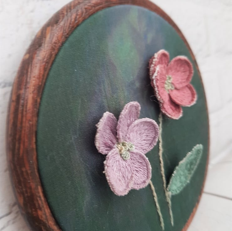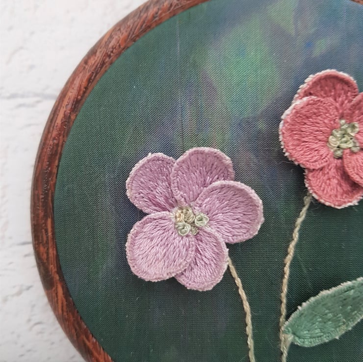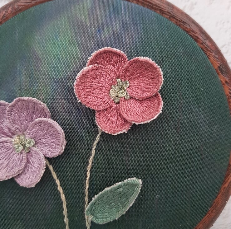 Completely hand embroidered, this hoop features two 3D stumpwork flowers, on a dyed green silk backing.