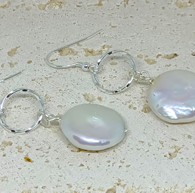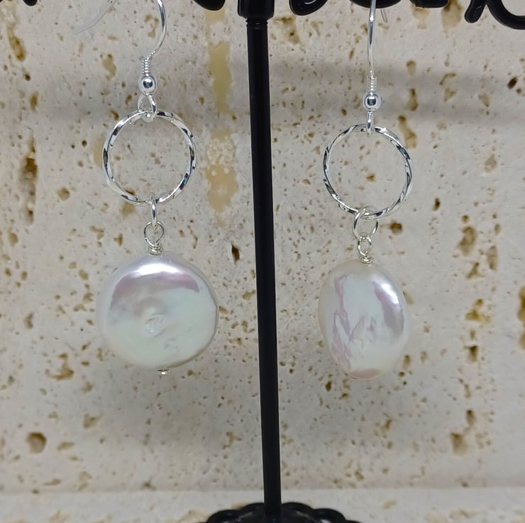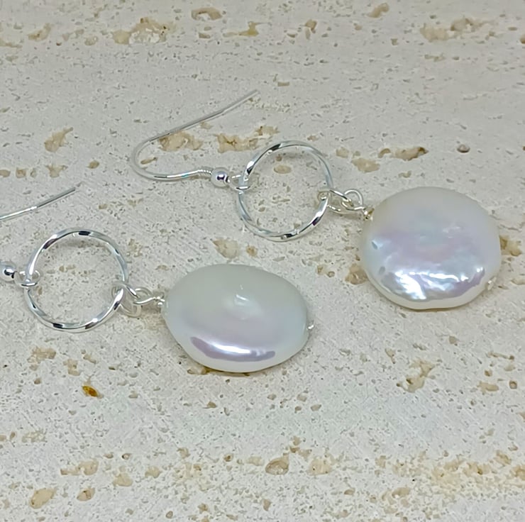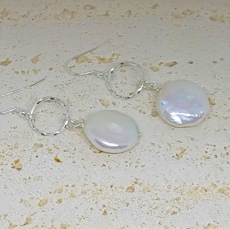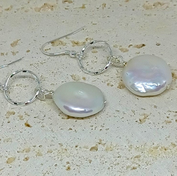 These earrings feature a white coin pearl suspended below a twisted texture sterling silver circlering. Please see photos for an indication on size. The coin pearls are white, with a beautiful lustre.
