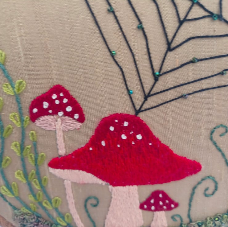 Multi mushroomtoadstool design, with ferns, foliage, and a lovely spiders web! Hand stitched using silk threads on to a golden worsted silk base, this has lovely texture to the design. It also has some tiny beads added for a little bit of sparkle! Framed in a 6 inch hoop.