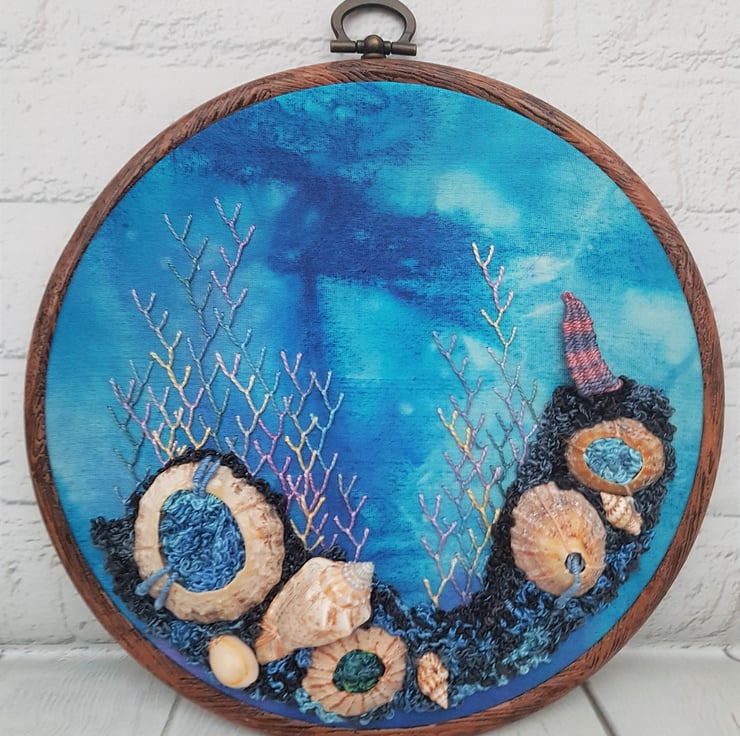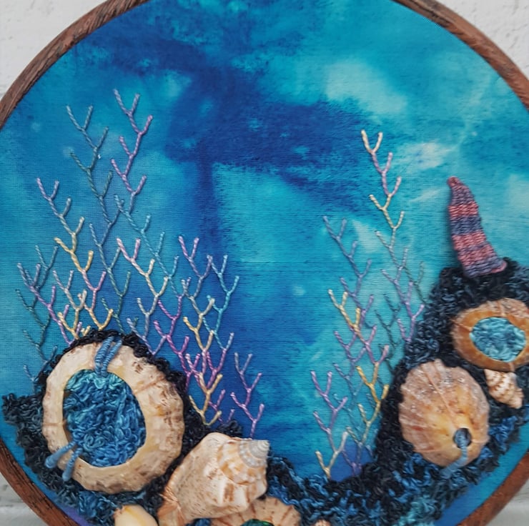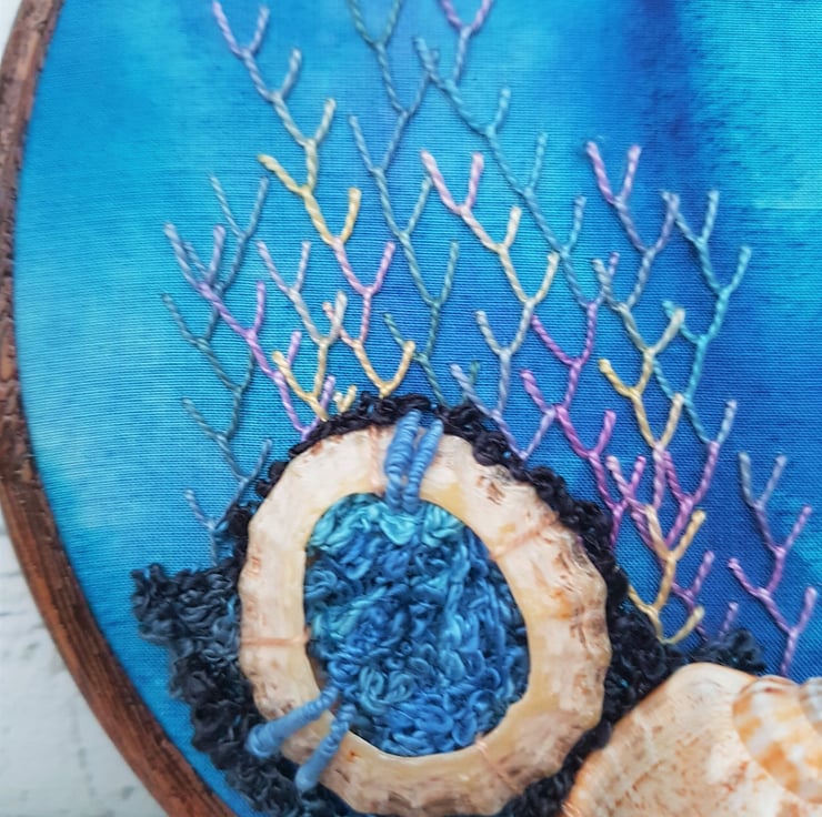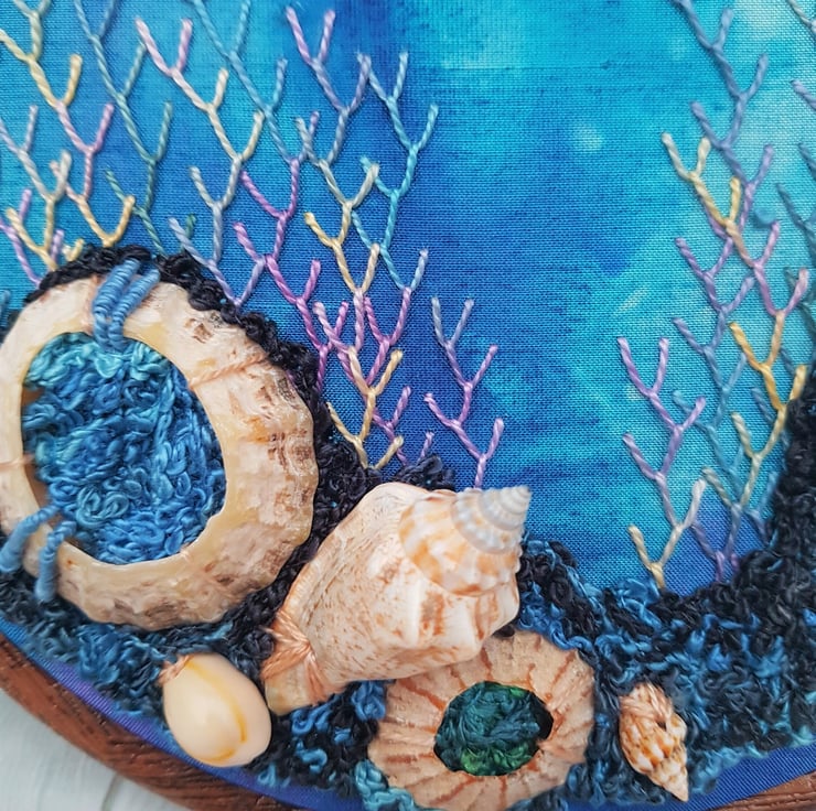An assortment of genuine shells are added to a gorgeous dyed silk backing, which is very reminiscent of the ocean. All hand embroidered using amazing perle threads, which give the stitching that beautiful lustre.
