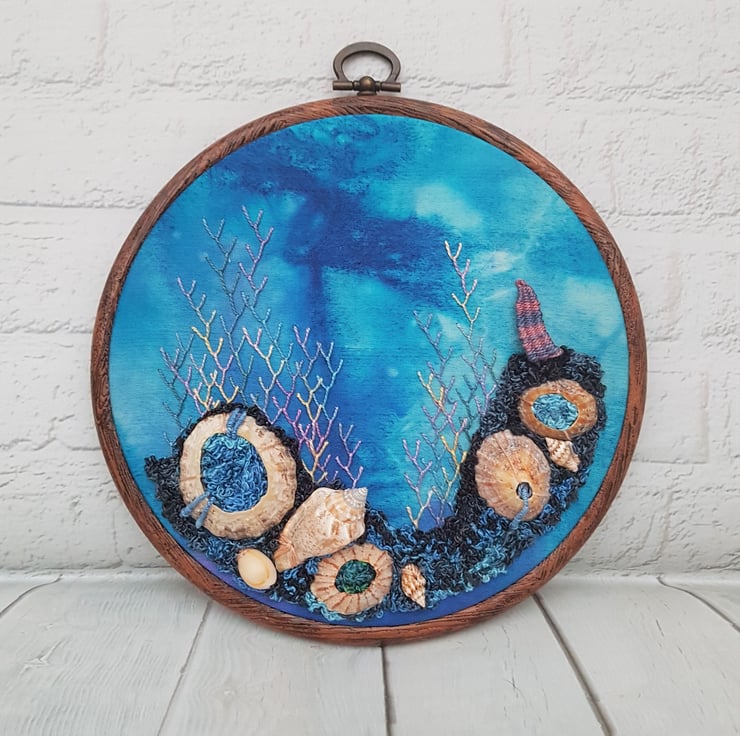 Seascape Hand Embroidery Hoop with Shells.