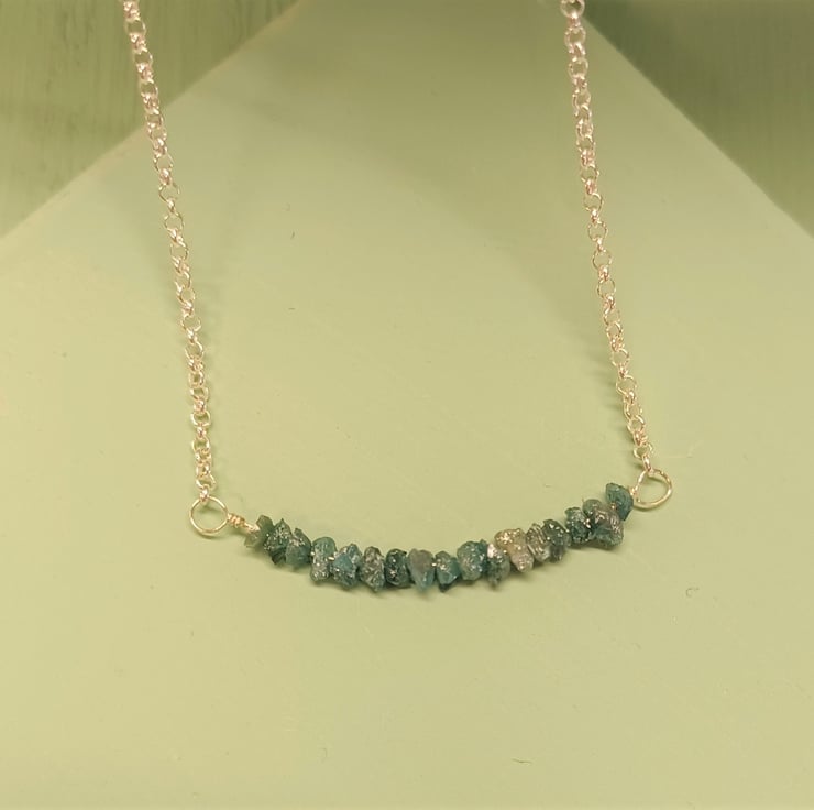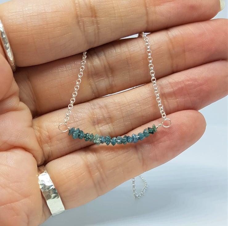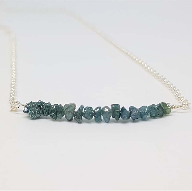 Beautiful blue rough diamond chips have been threaded onto sterling silver wire, and set into a delicate, but strong, sterling silver rolo chain, to create this bar style necklace