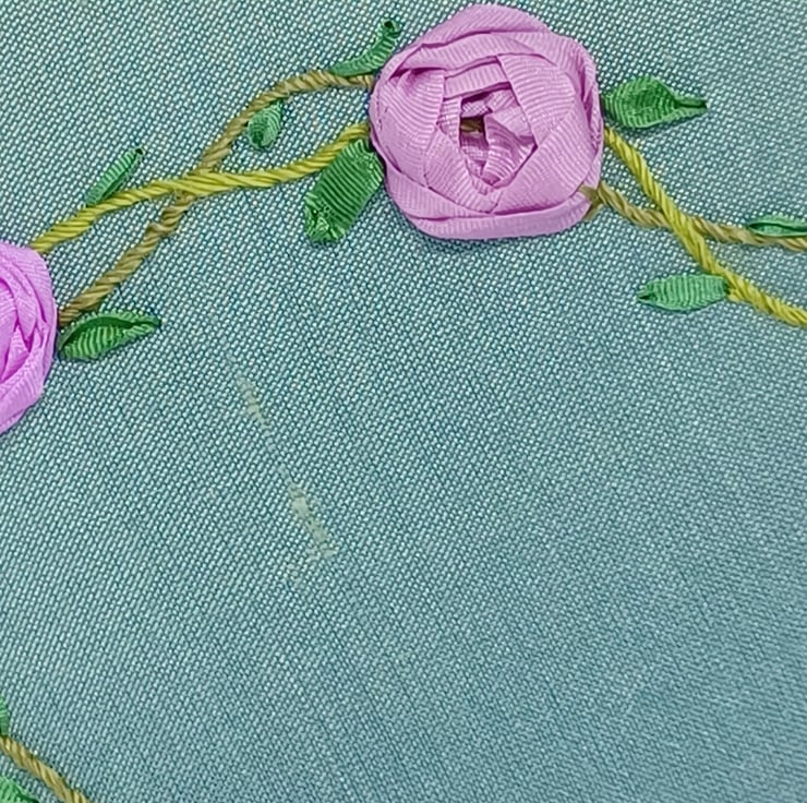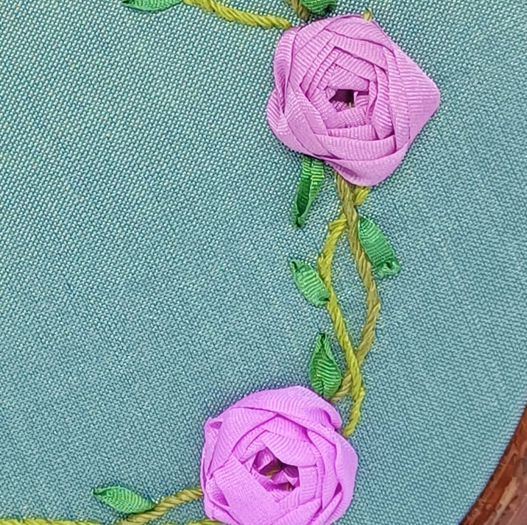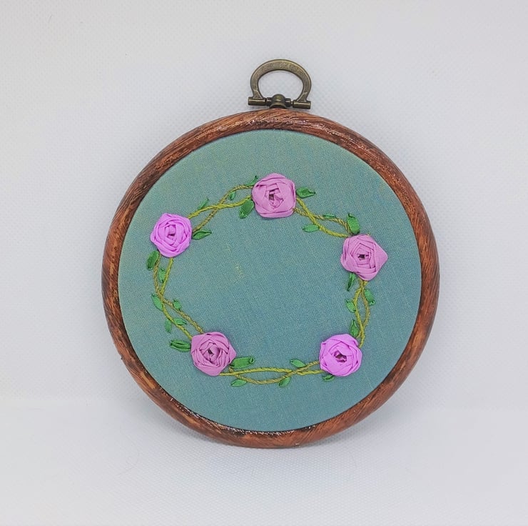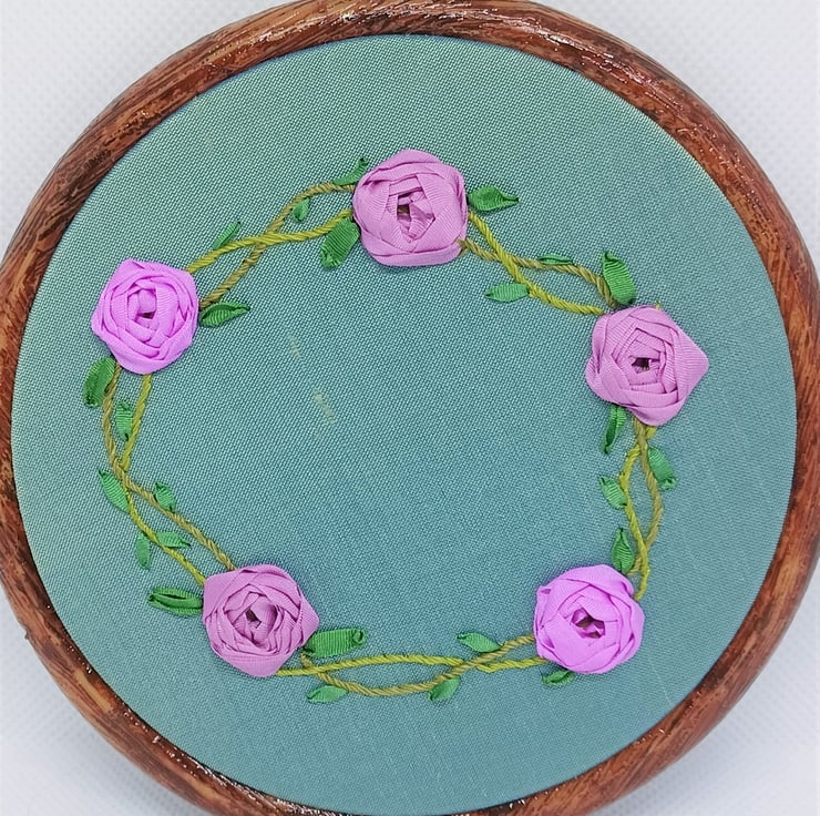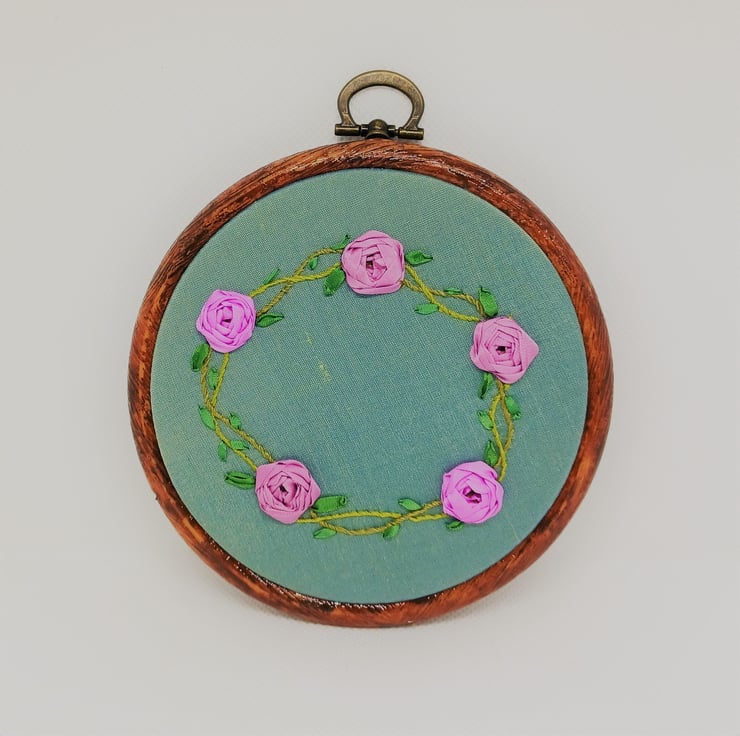 The ribbon roses wreath is completely hand embroidered using silk ribbons, on to a silk fabric base. The circle wreath has a green silk base, and is framed in a 4 inch hoop.