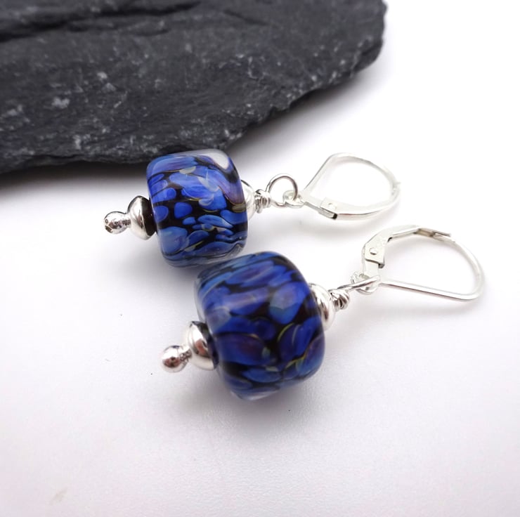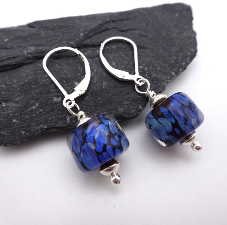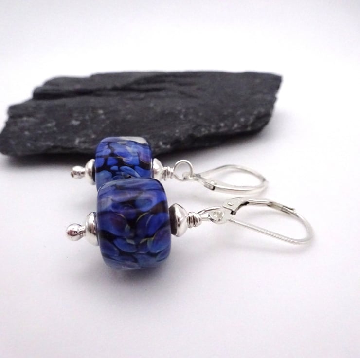 They feature sterling silver lever back ear wires and handmade lampwork blue and purple glass beads.