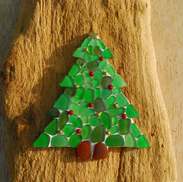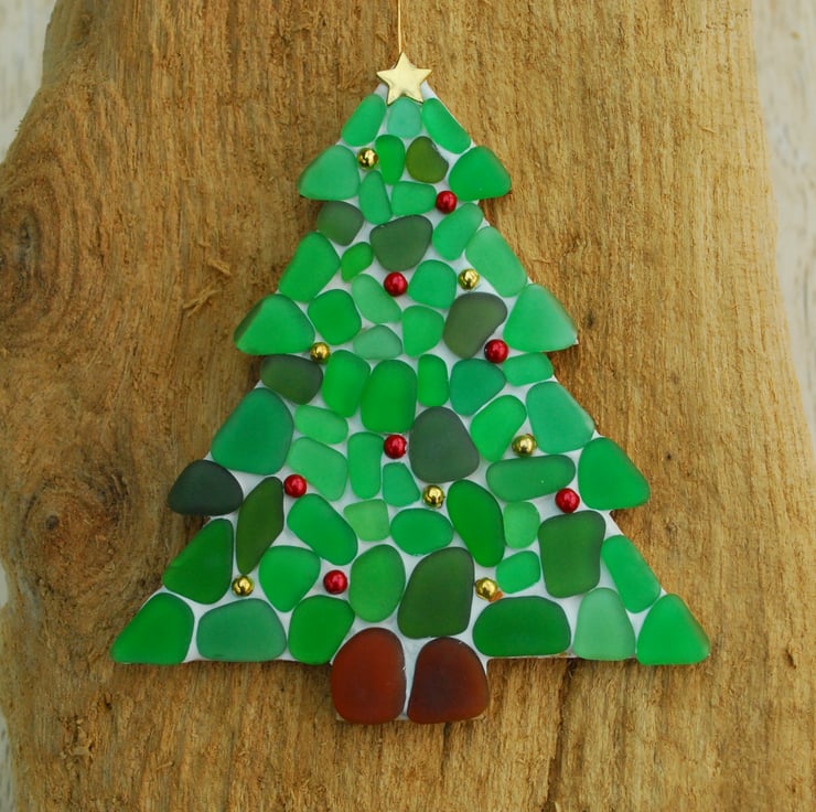 We've made this gorgeous hanger from tumbled beach glass and beads. The glass has come from old bottles, so there are many different shades of green. The pieces of glass are slightly curved, which gives the hanger a three-dimensional effect. There is a brass star at the top of the tree, and the back is laser-cut plywood with an attractive brown edge.