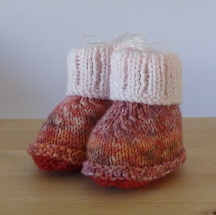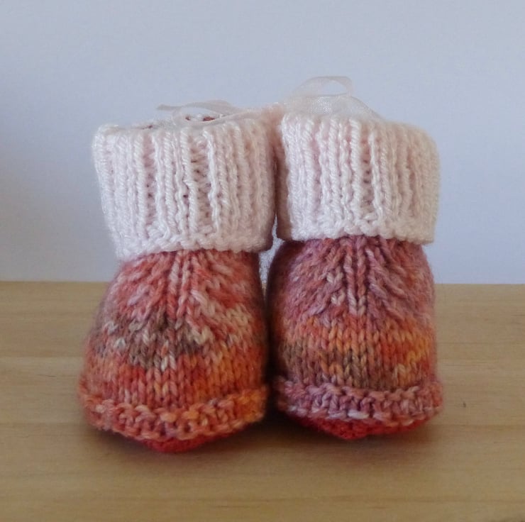 A pair of hand knitted baby booties in a lovely soft variegated yarn in oranges, beige and pinks. The sole is in a reddish orange yarn, the foot is variegated and the turn down cuff is in a pale pink.