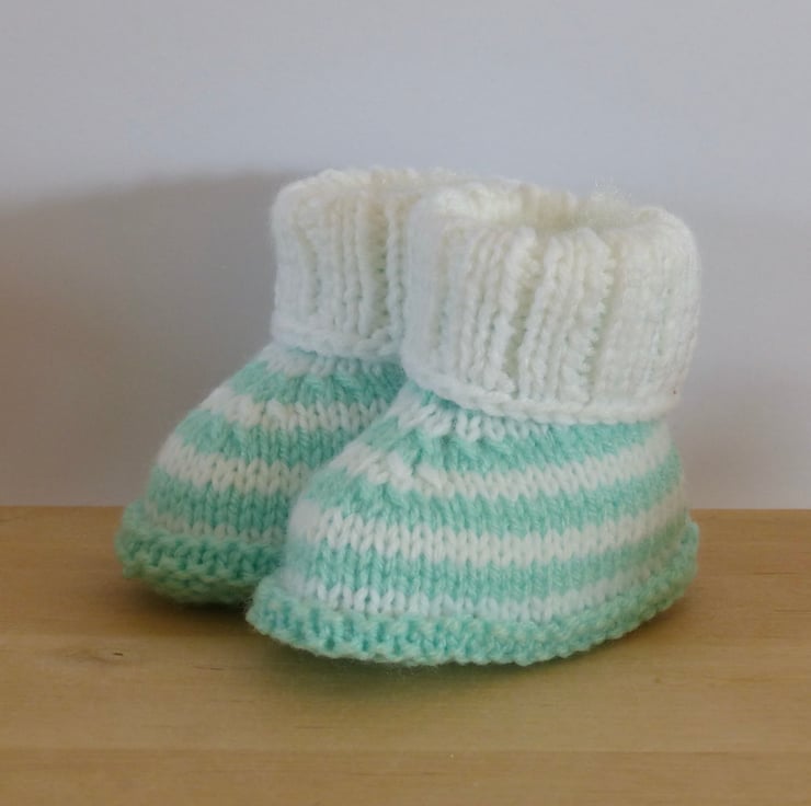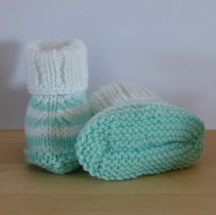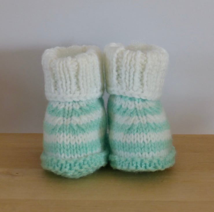 A pair of hand knitted baby booties in Mint Green and White yarns. The sole is plain Mint Green, the foot is striped and the turn down cuff is White.