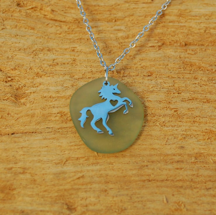 An ideal gift for lovers of horses, this lovely pendant has been made with a piece of tumbled beach glass. The glass, which is an unusual colour, makes the perfect backdrop for the stainless steel horse charm.